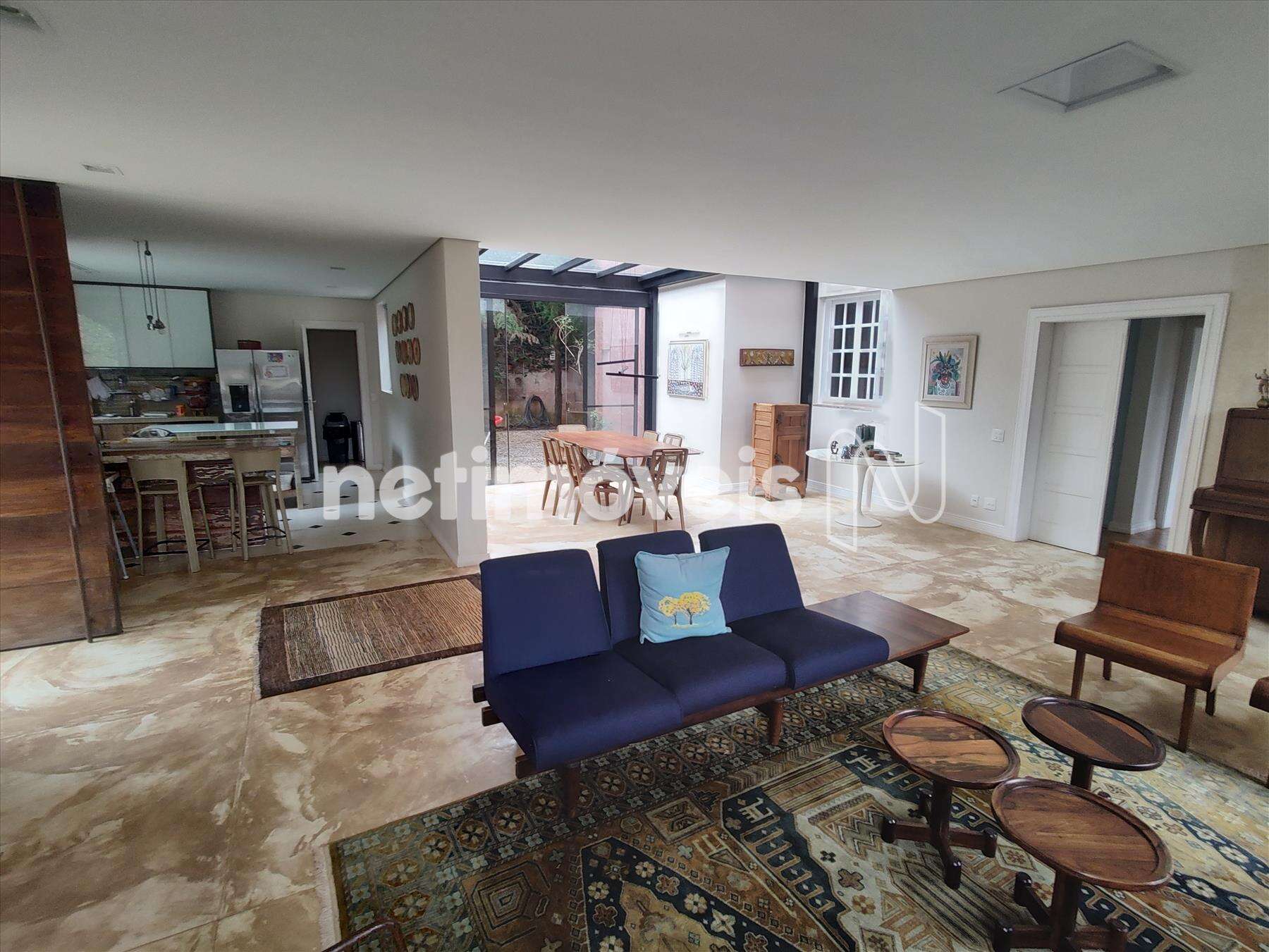 Sala de visita integrada com cozinha e sala de jantar. Sala de jantar em estrutura de vidro. Cozinha com ilha e eletrodomésticos premium. Sala de visita com lareira.