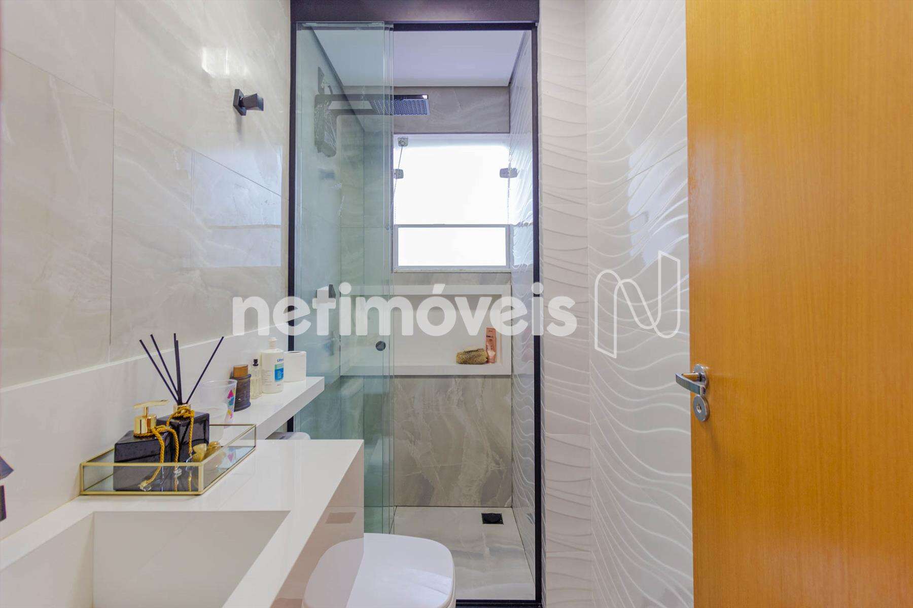 - Banhos suíte e social com piso, paredes, bancadas em porcelanato e box em vidro temperado.