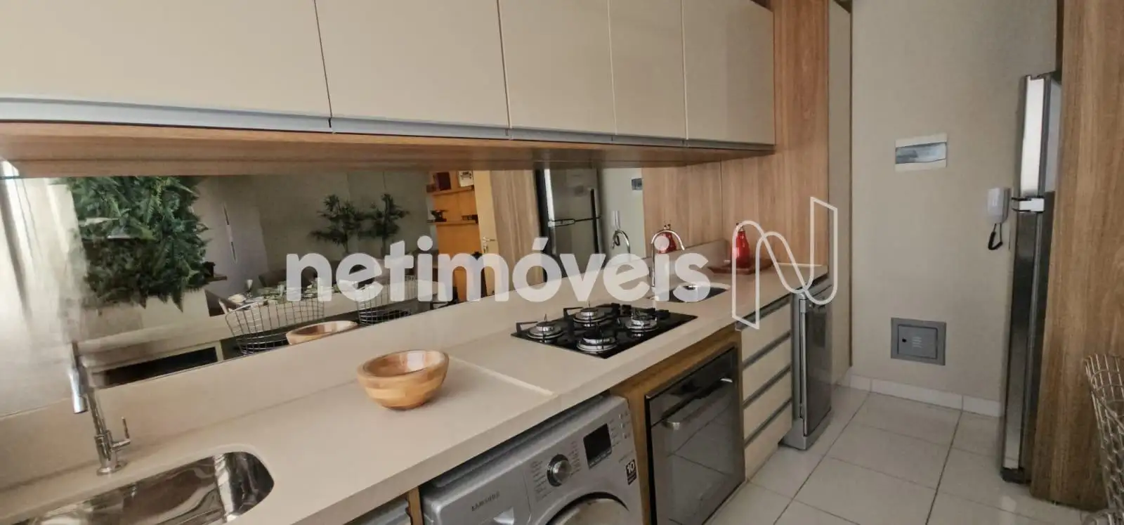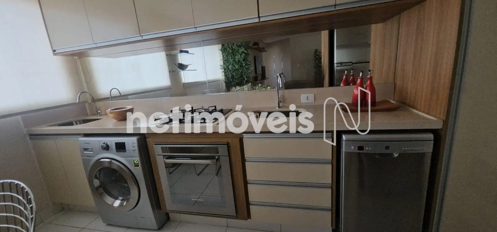 Cozinha com armários, fogão, geladeira, máquina de lavar, piso em porcelanato.