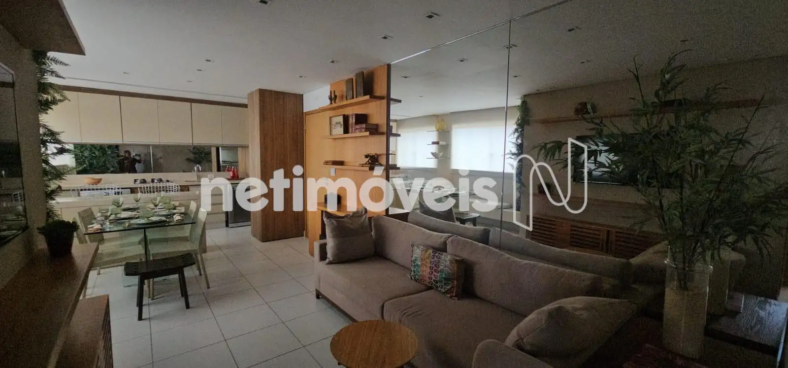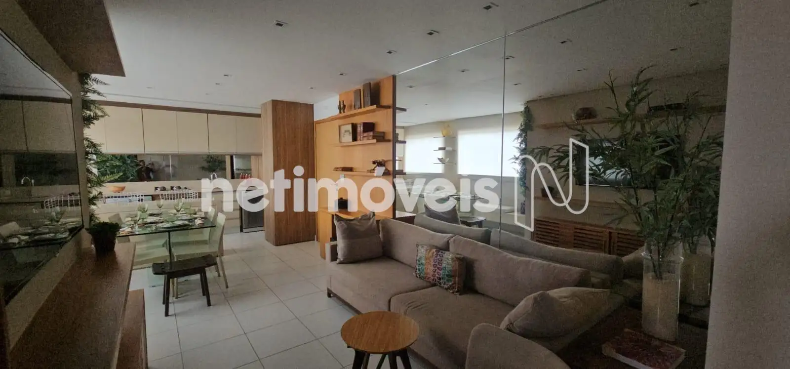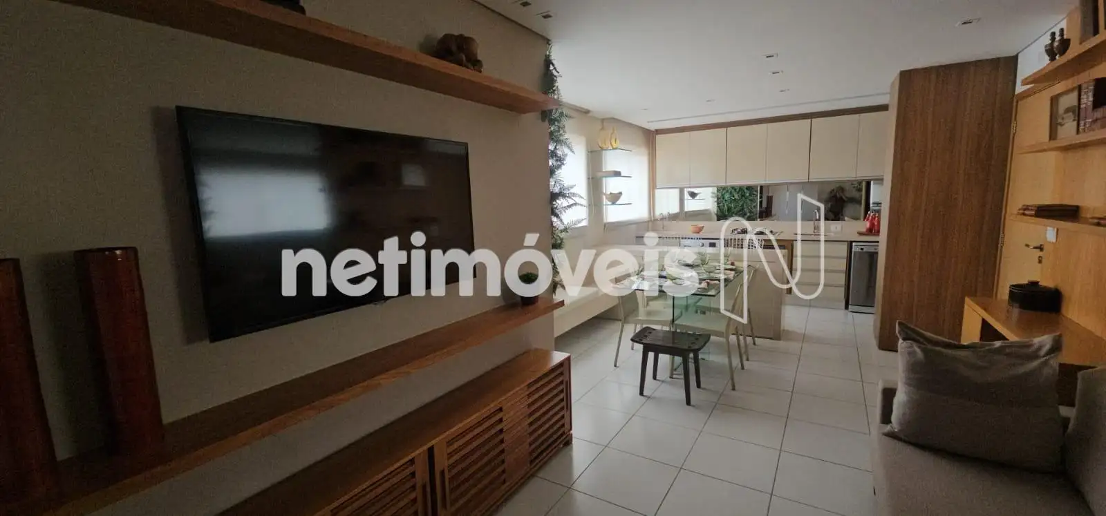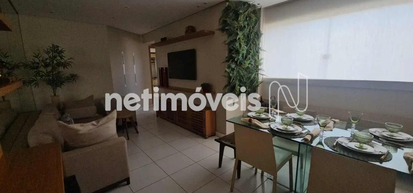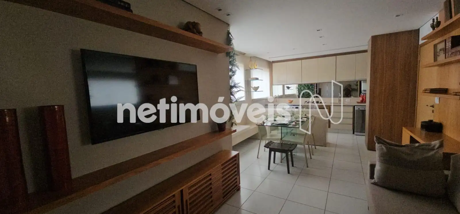 Sala para 2 ambientes com painel de TV, mesa de jantar com cadeiras, sofá, piso em granito.