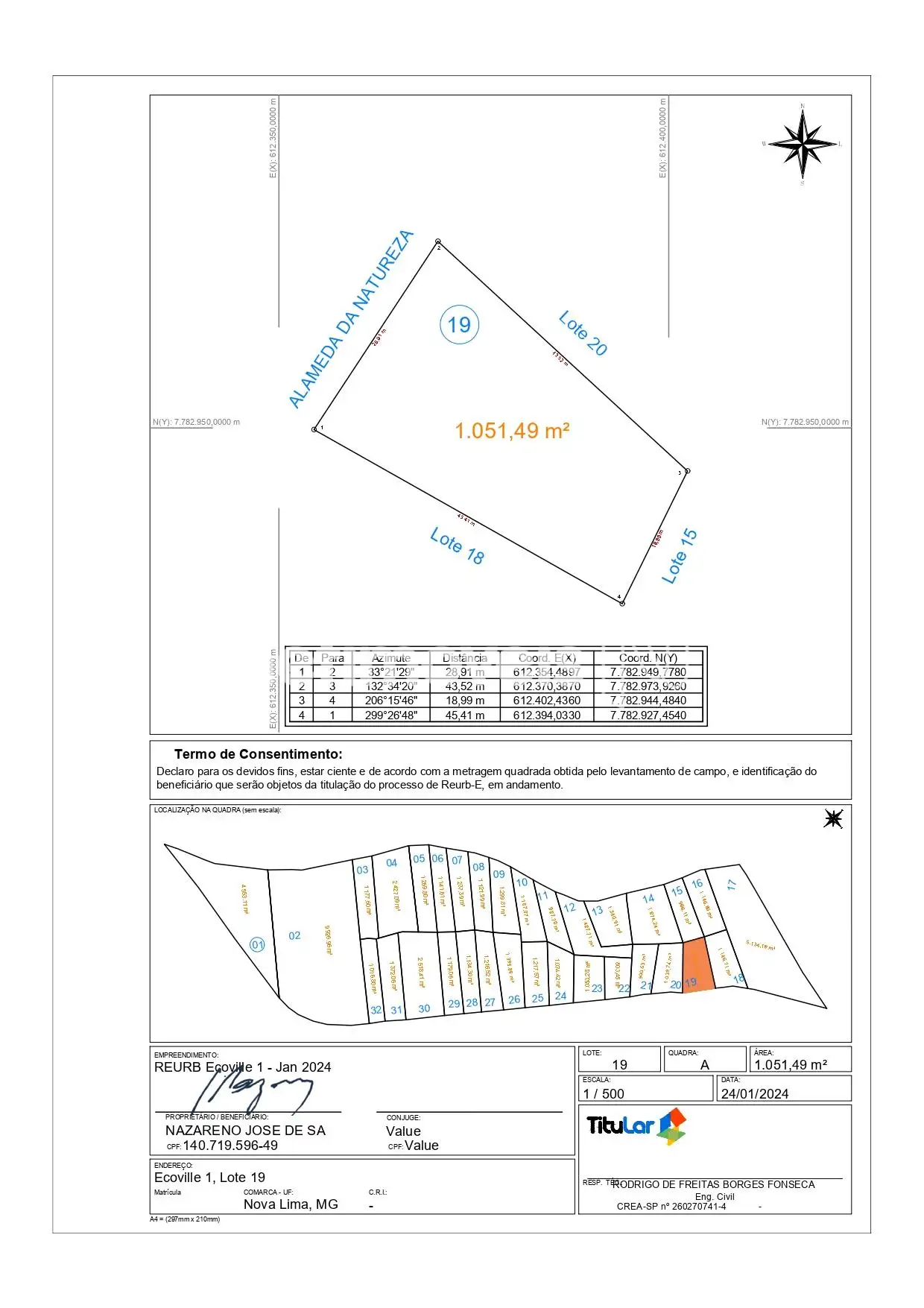 O lote de 1.051 m2 fica no bairro Engenho, mais precisamente no condomínio EcoVille 1, que tem entrada controlada de visitantes. Ele tem aclive suave, possibilitando muitas opções de construção.