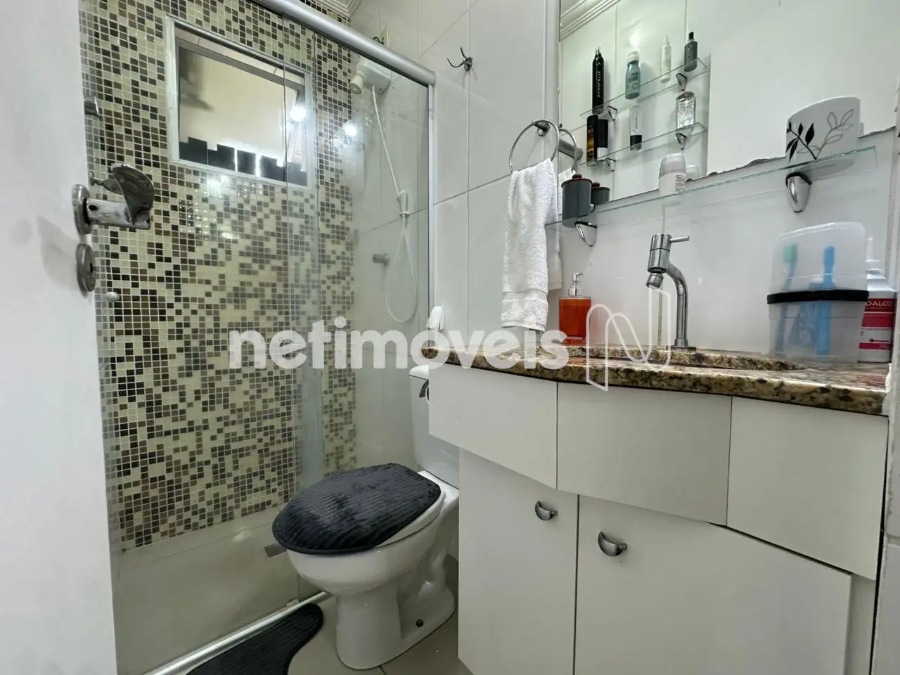 Banheiro social com bancada em granito, armários, espelho e box em blindex