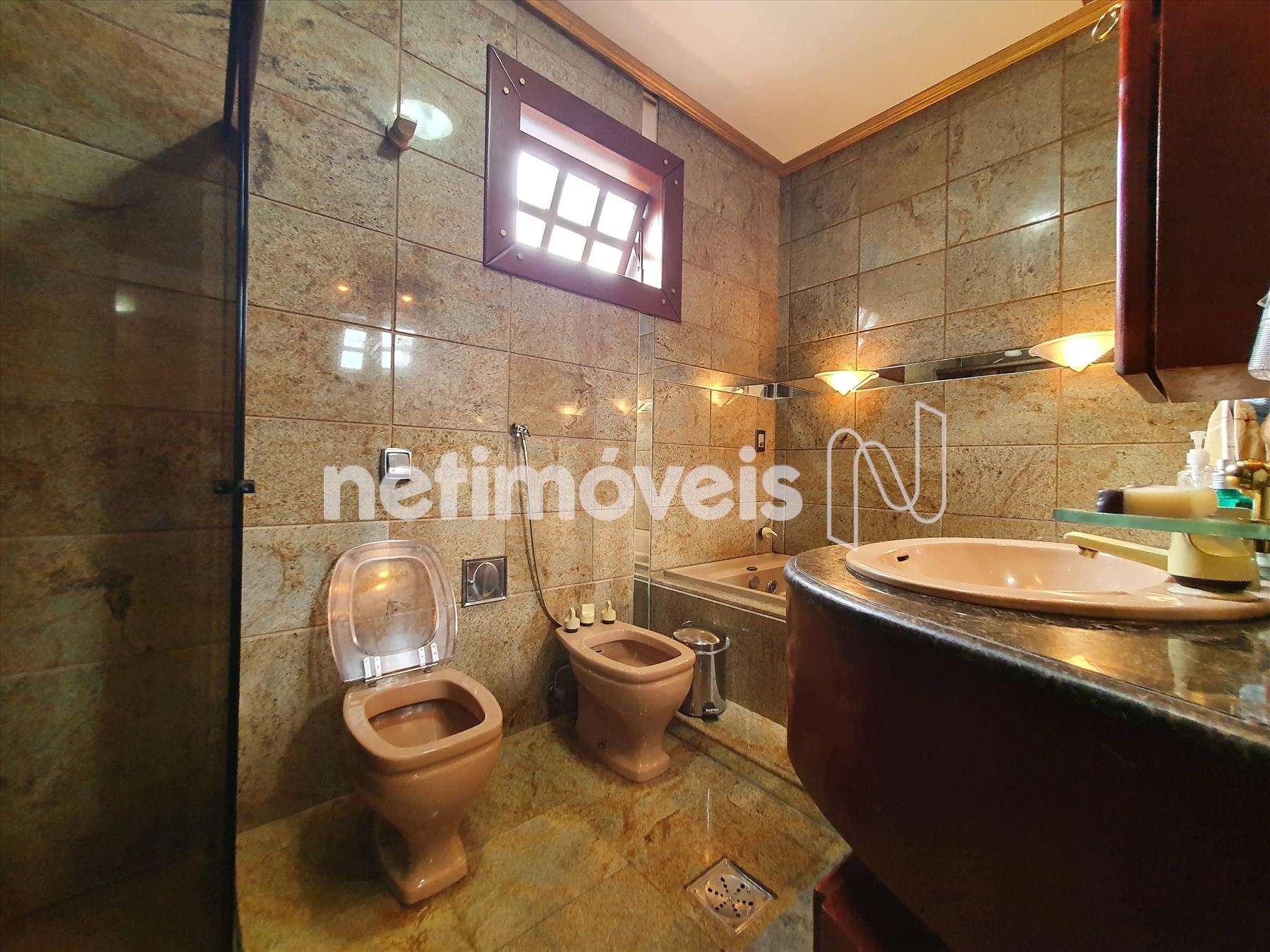 Lavabo com paredes revestidas, bancada em mármore e piso em granito