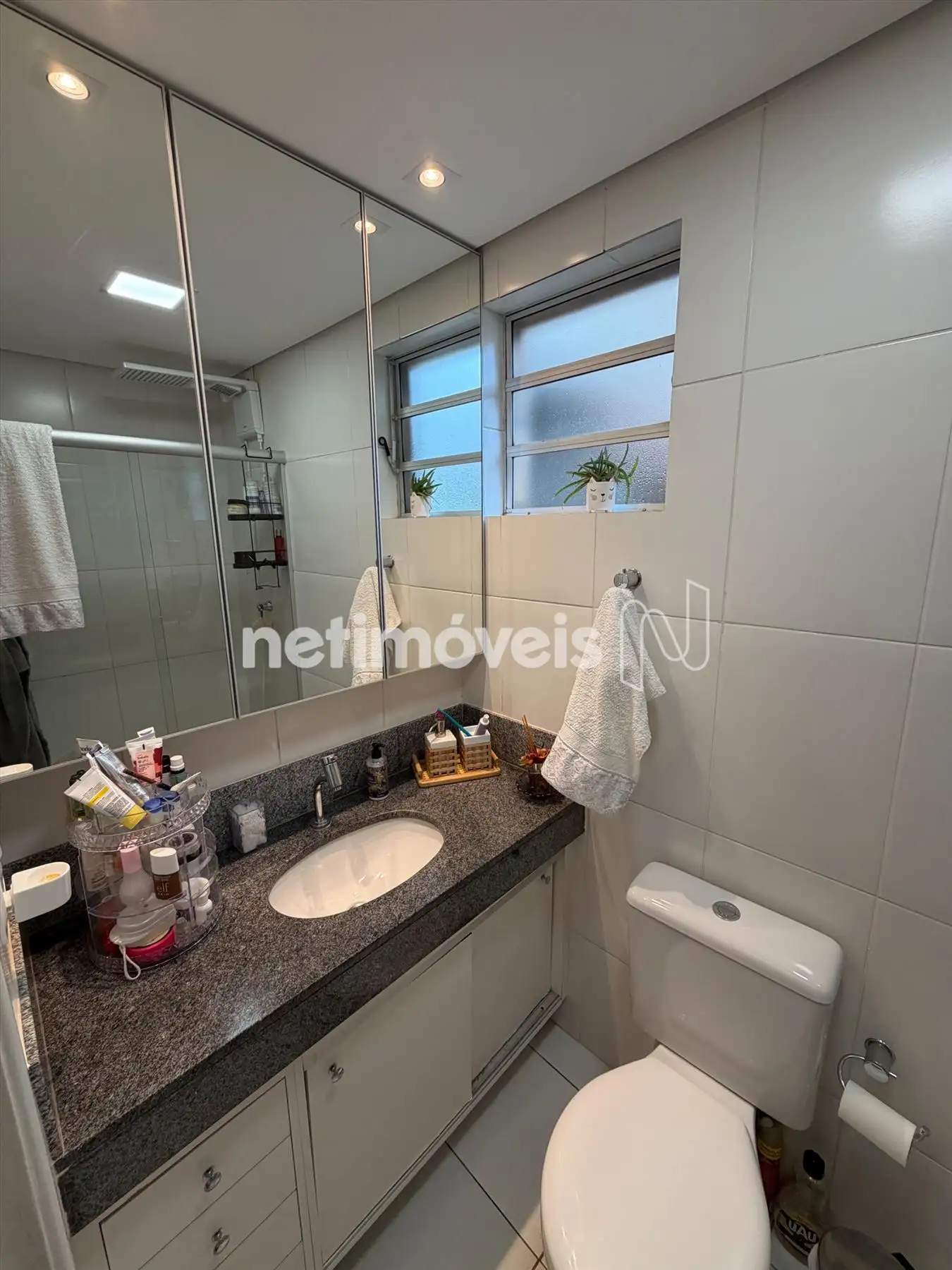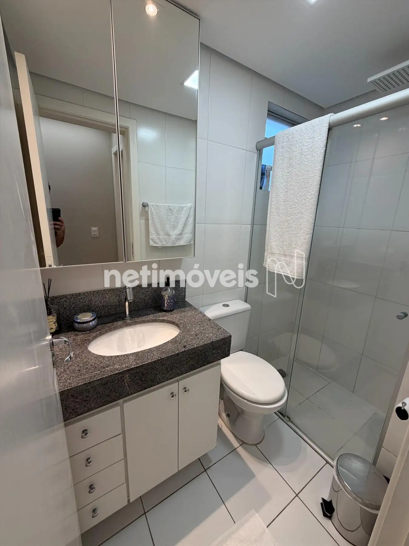 - Banheiro social com armário planejado, espelho e box de vidro