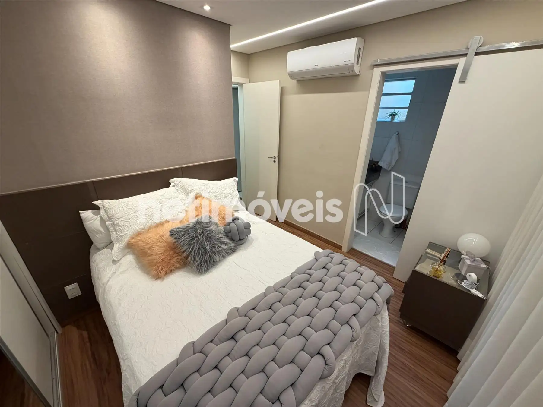 - 1 suíte com armário planejado, ar-condicionado e banheiro com armário, espelho e box de vidro