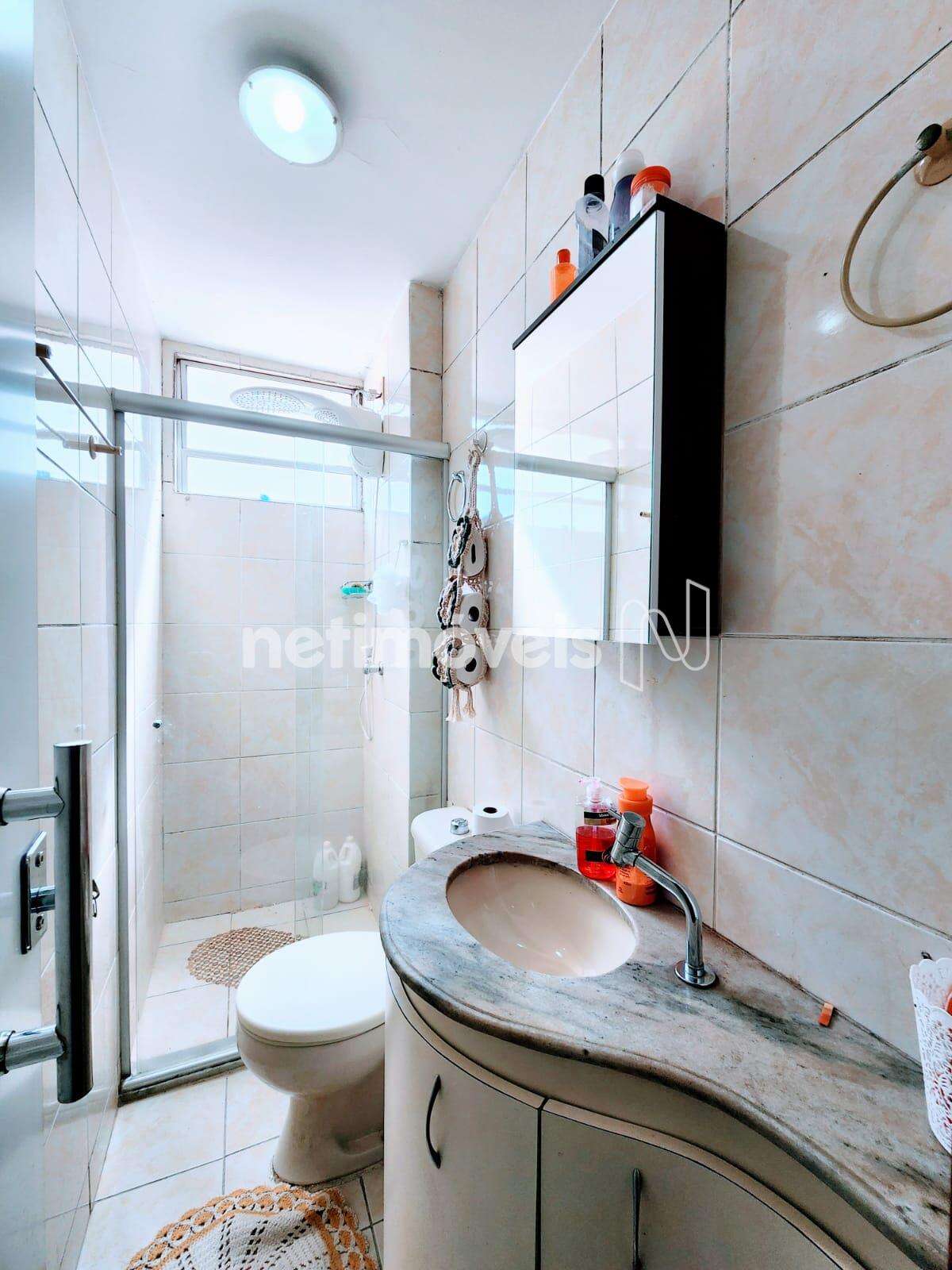 - Banheiro social com box em vidro blindex, armário planejado, espelho, piso e parede em cerâmica.