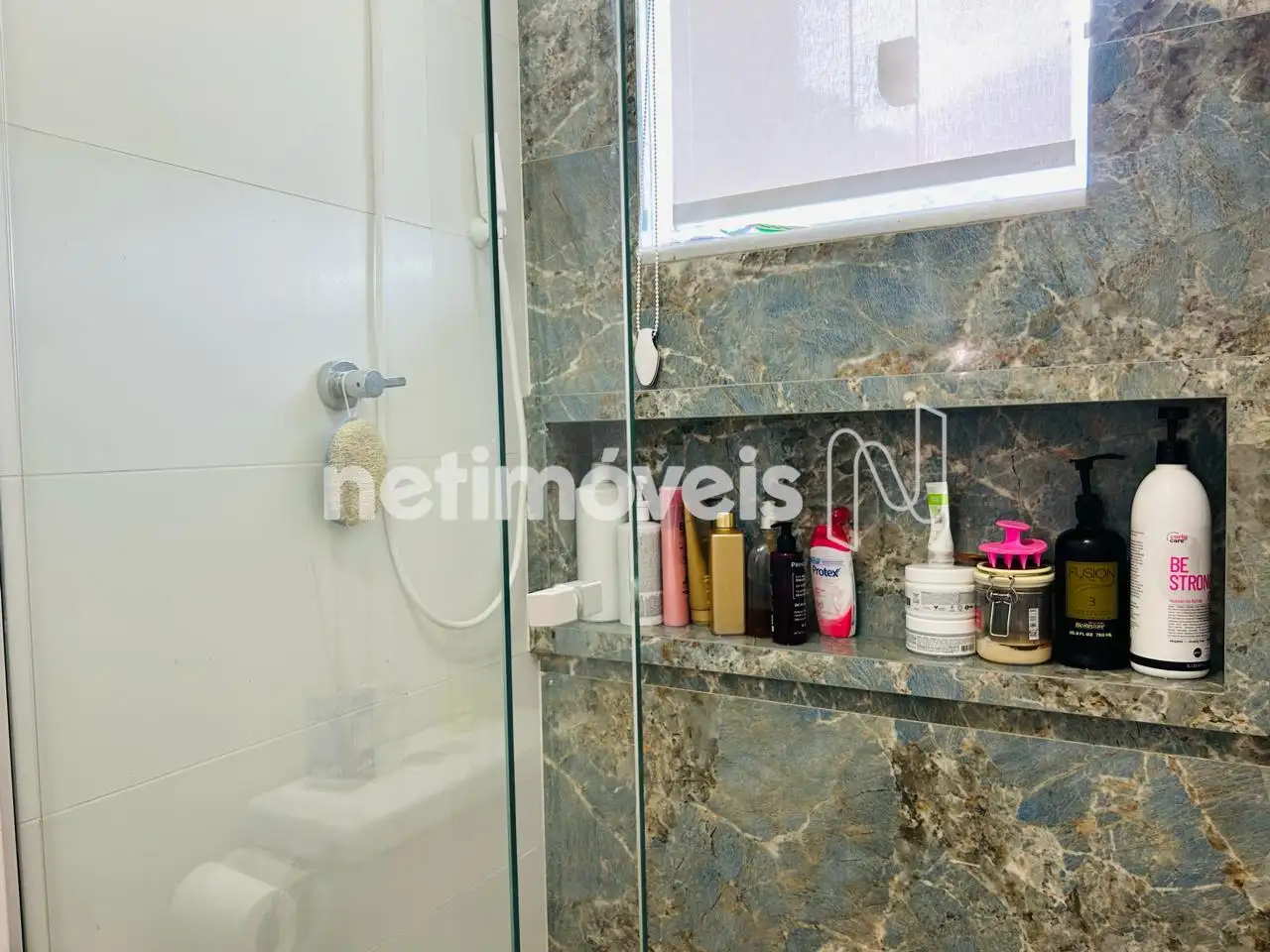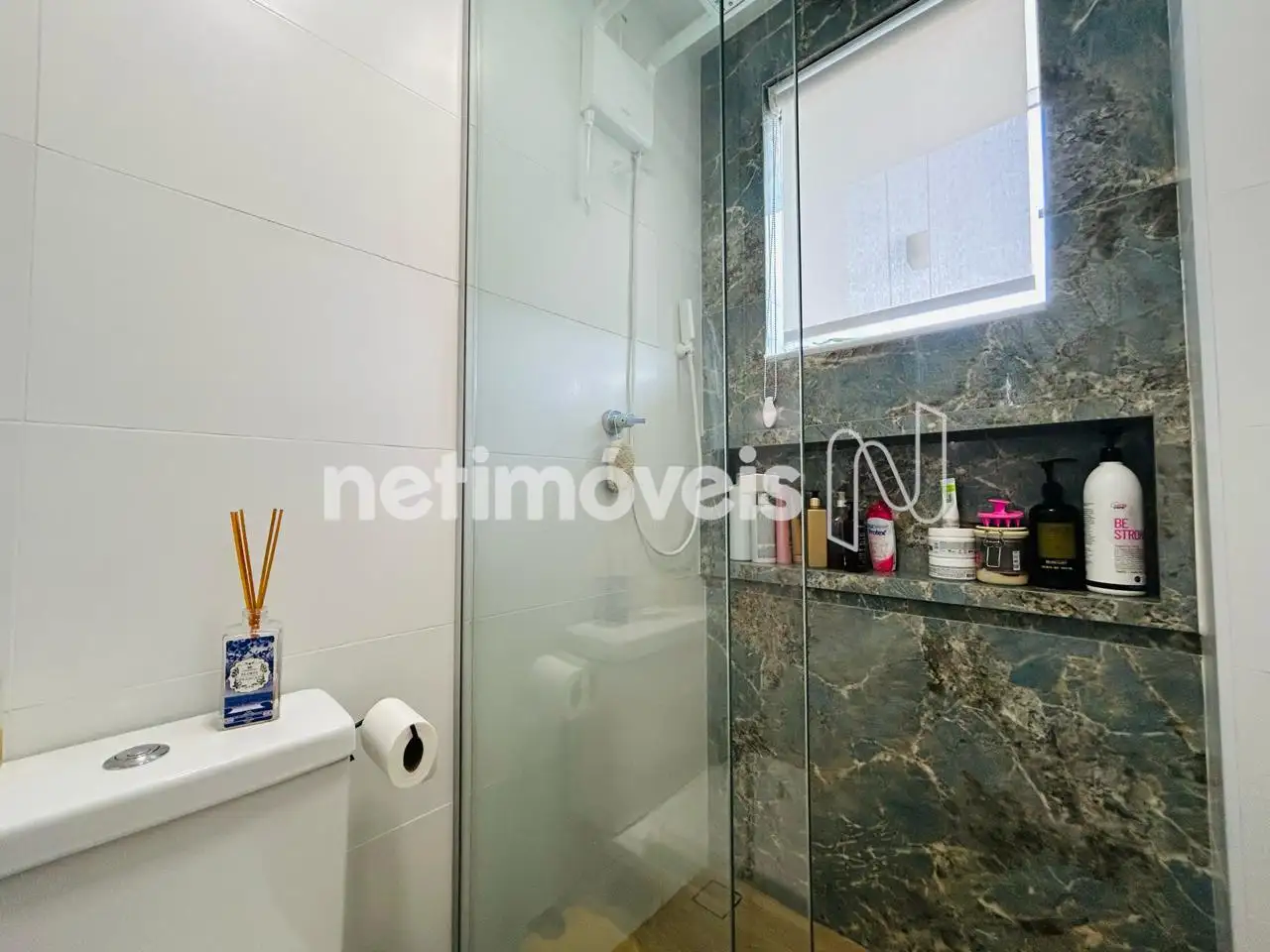 Banho social e suíte com armários, box blindex, piso e bancada em granito.