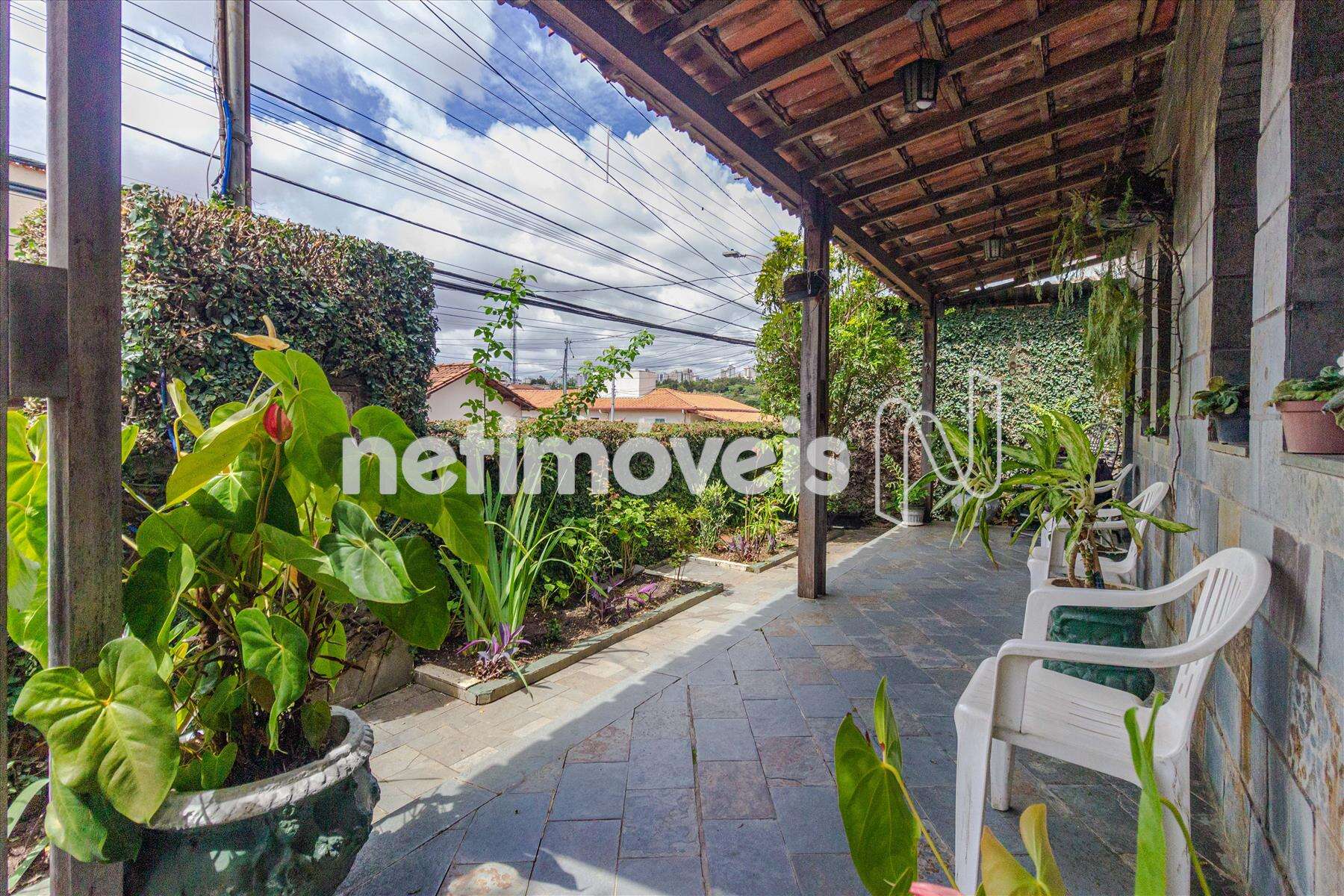 - Varanda aconchegante com jardim e telhado colonial.