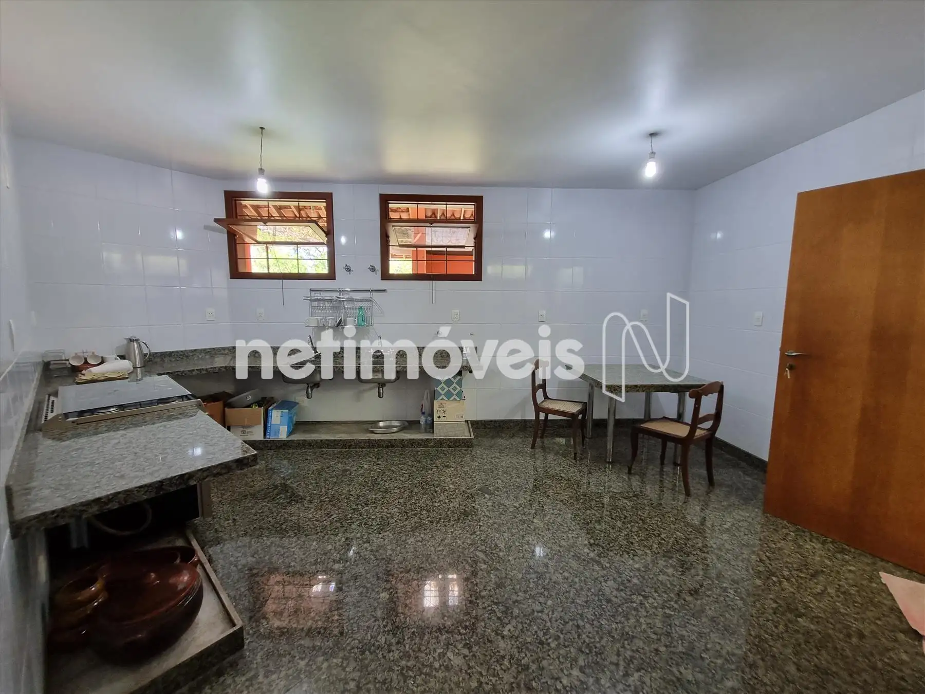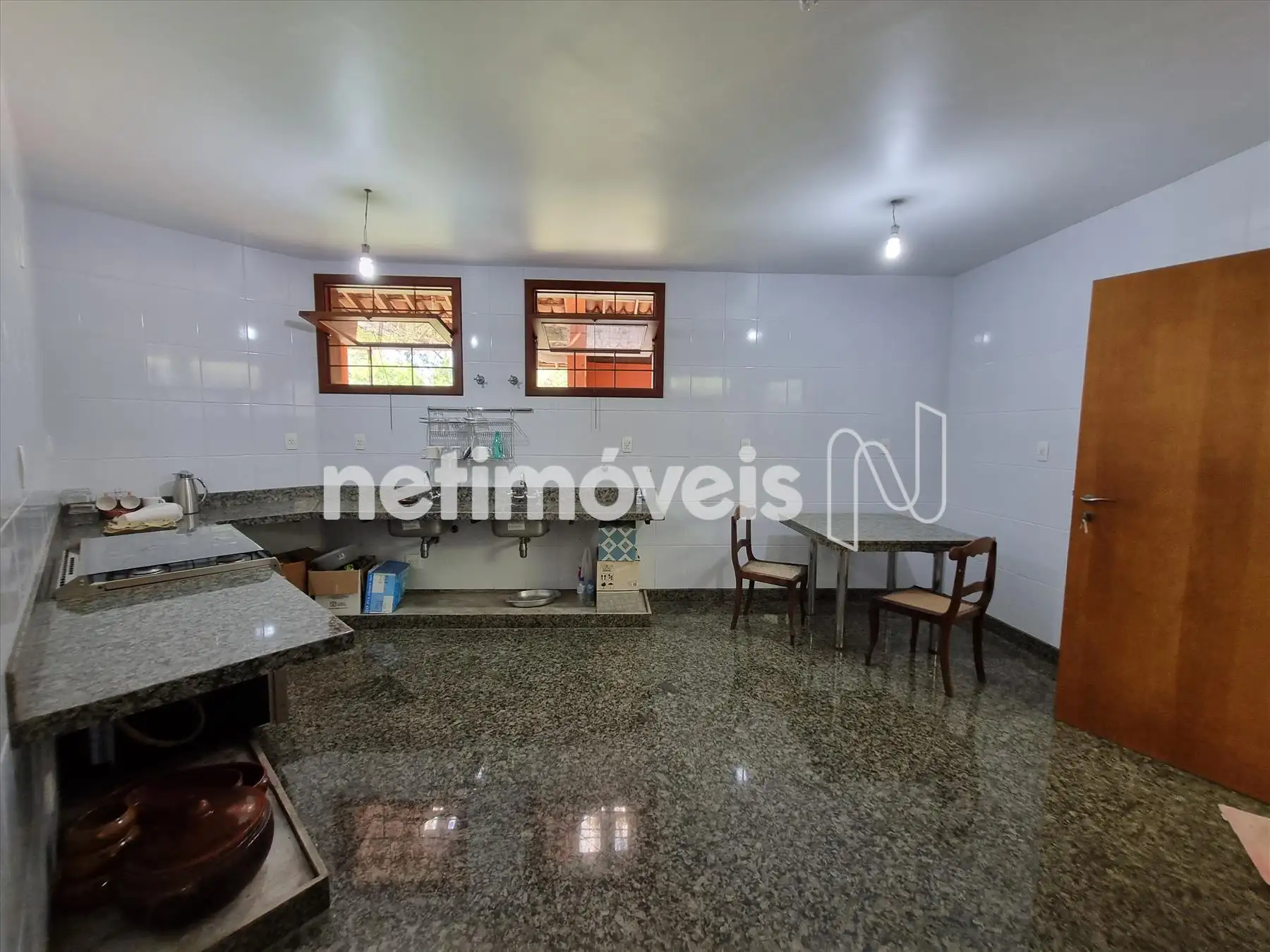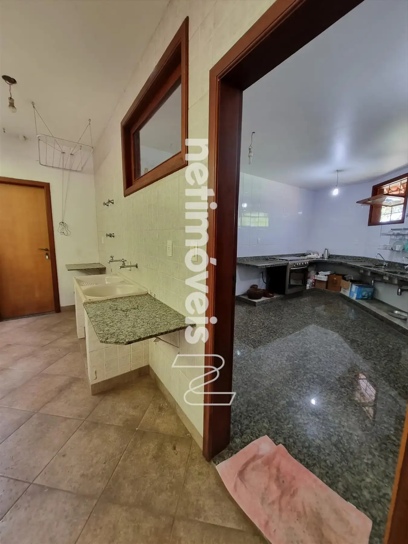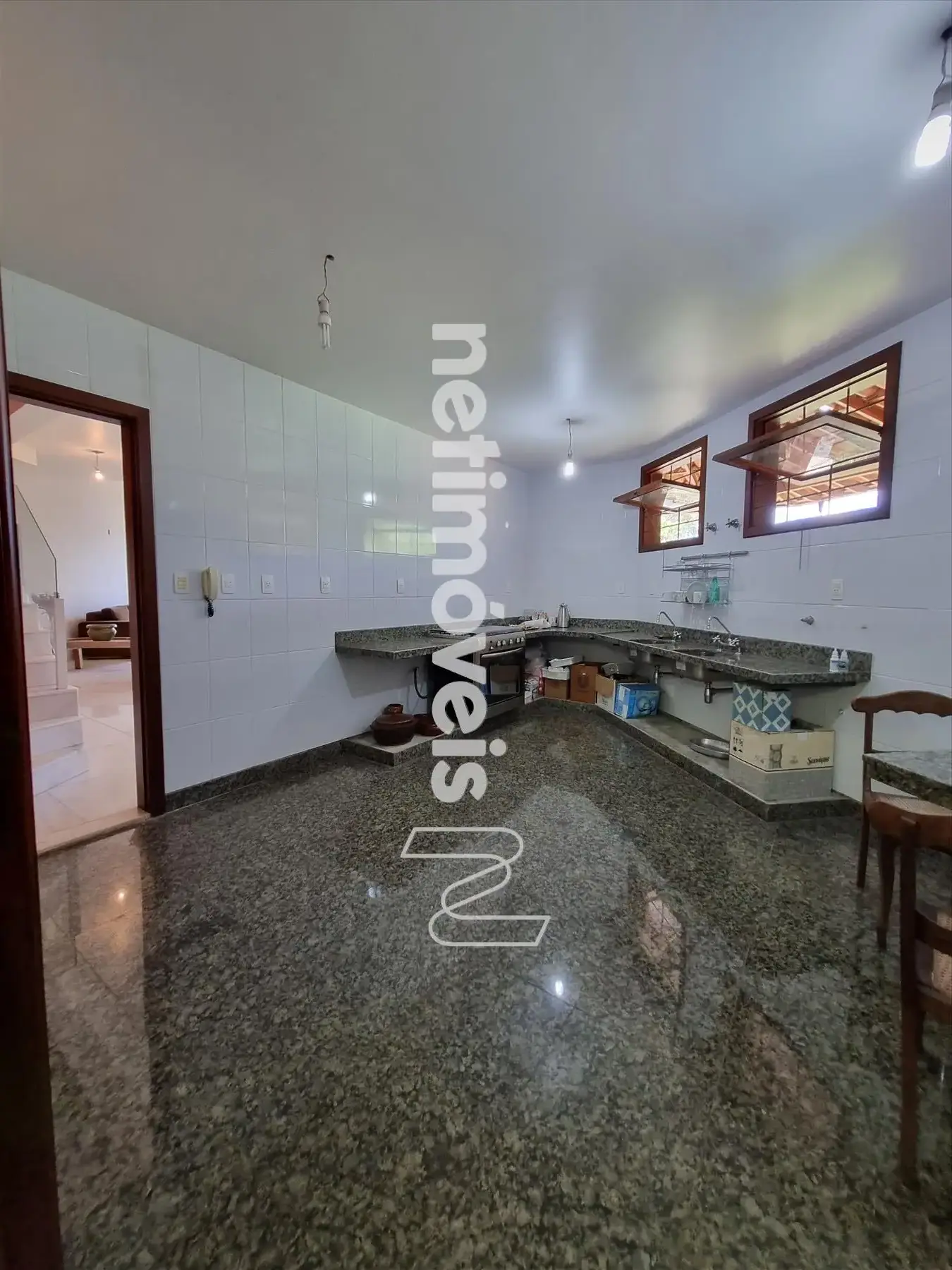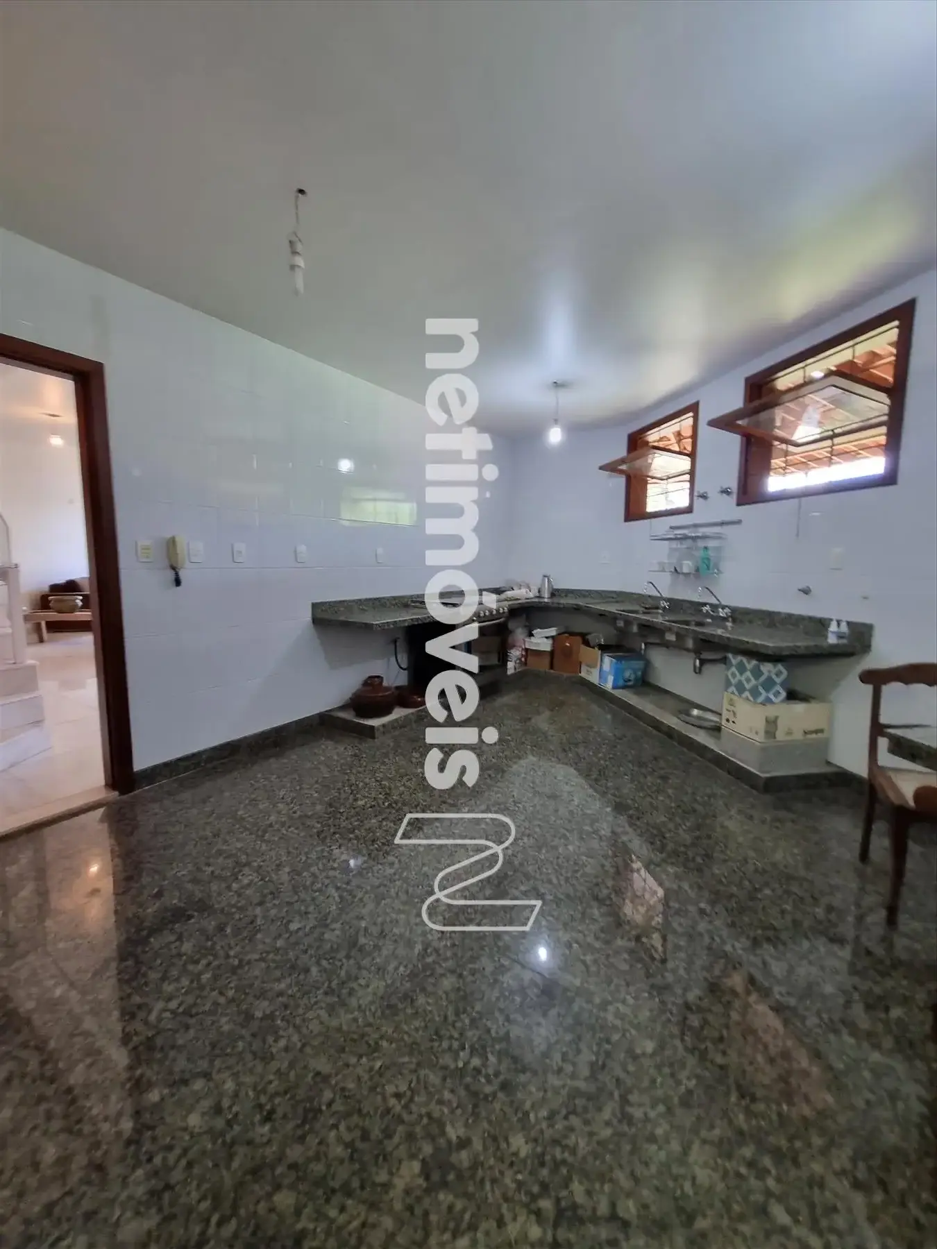 1 cozinha ampla com bancadas em granito, fogão com 5 acendedores, gás canalizado.