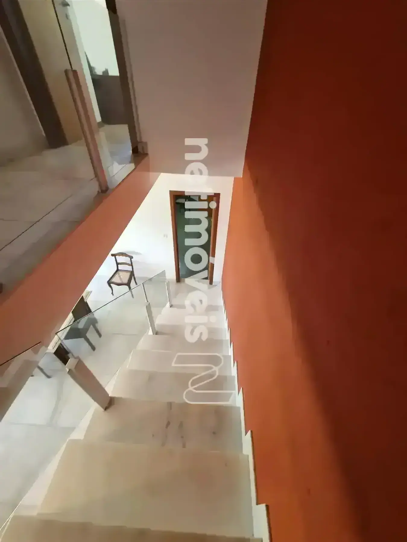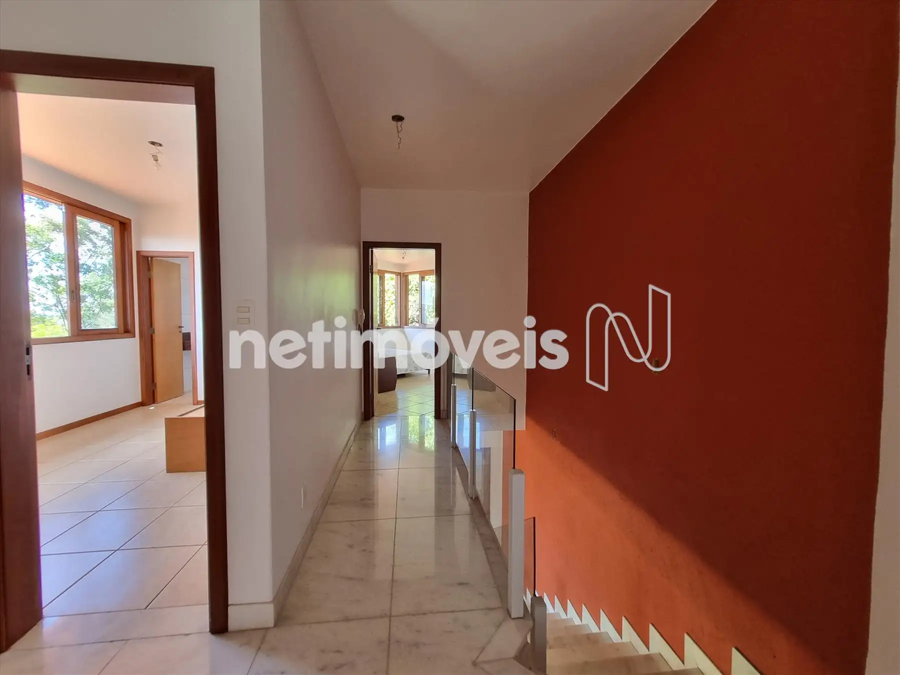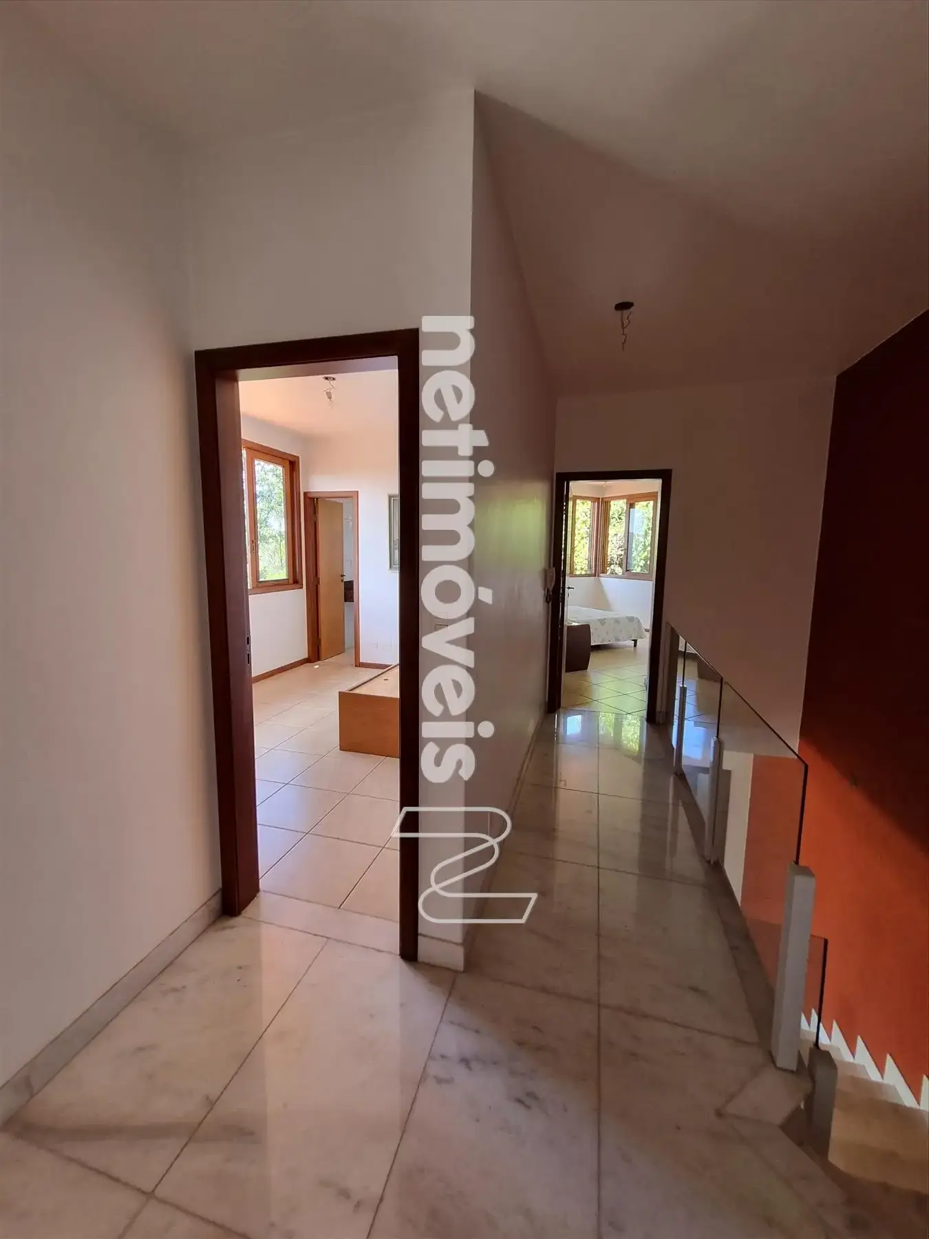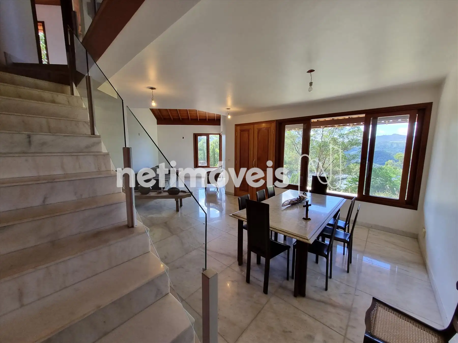 Escadas de acesso para segundo piso em mármore e guarda corpo em vidro.