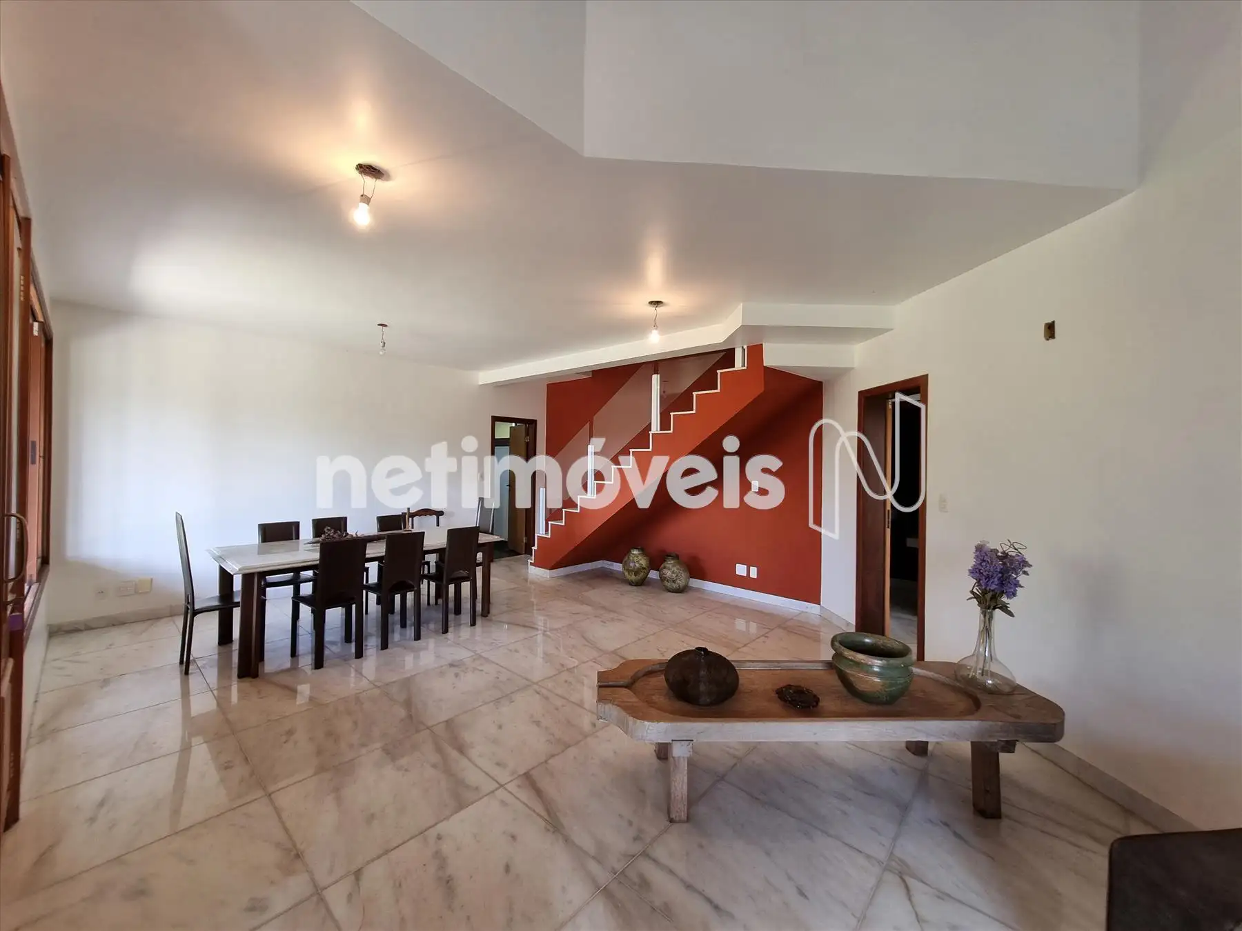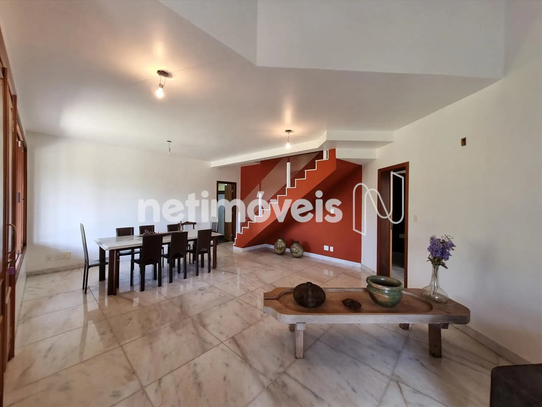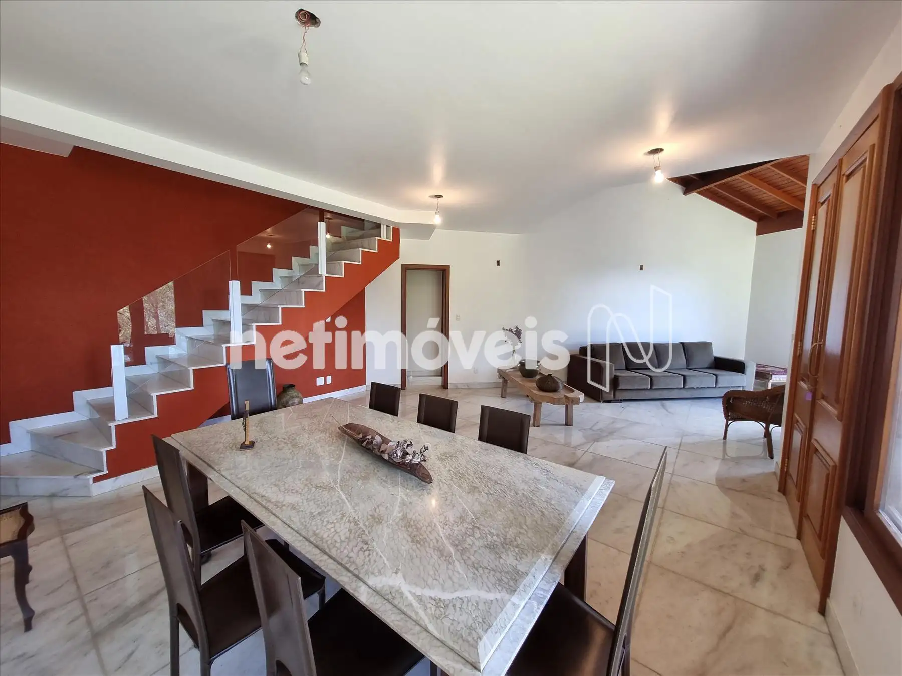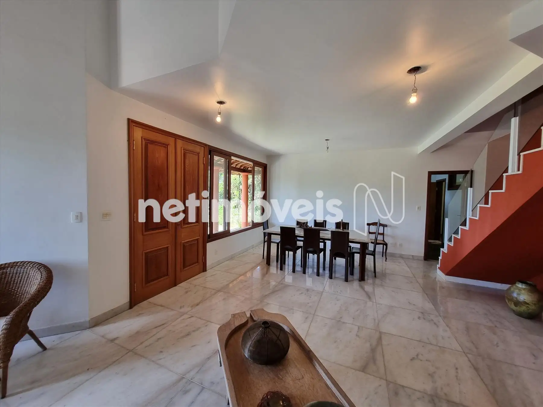 Escadas de acesso para segundo piso em mármore e guarda corpo em vidro.