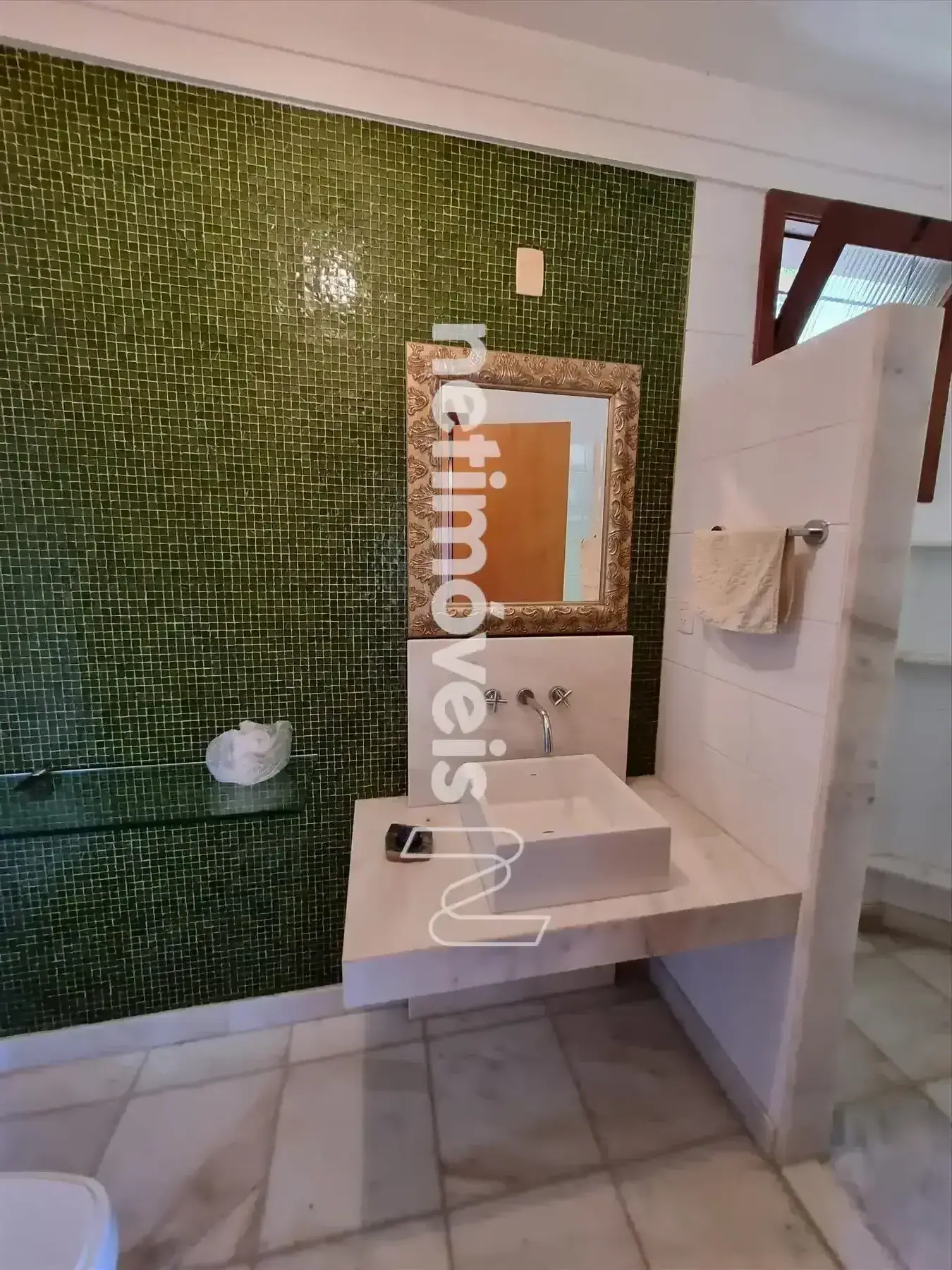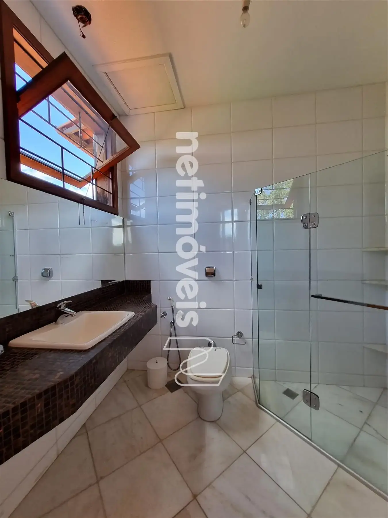 1 Suíte sendo o banho com bancadas em pastilhas de vidro e box blindex.