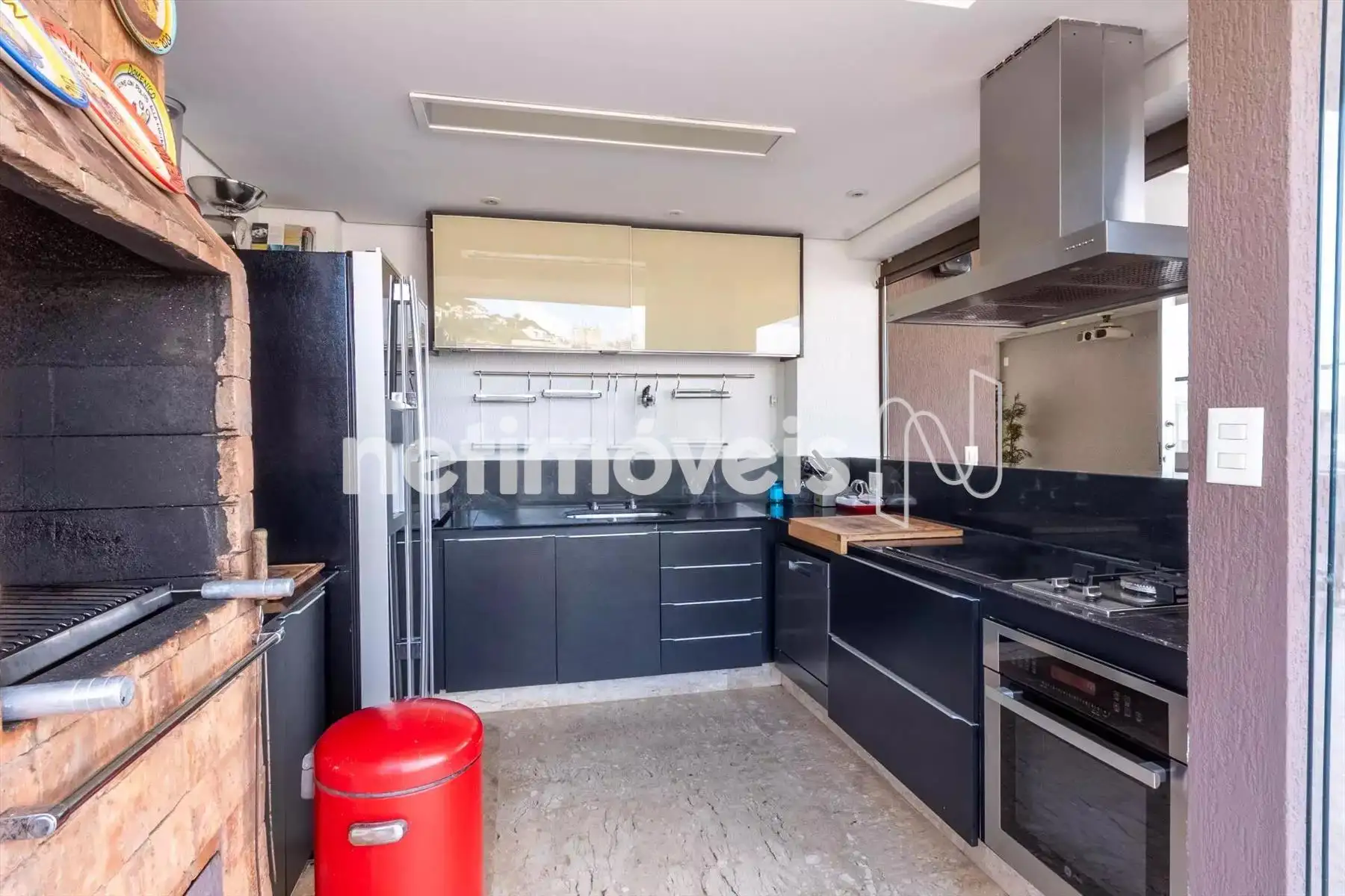 Área gourmet com churrasqueira, integrada à piscina privativa aquecida e com hidromassagem