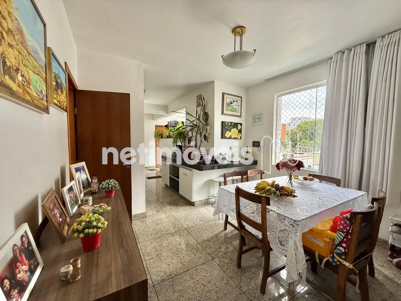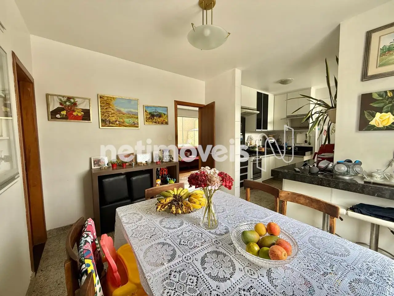 Sala ampla e bem arejada, cozinha reformada, sala de jantar.