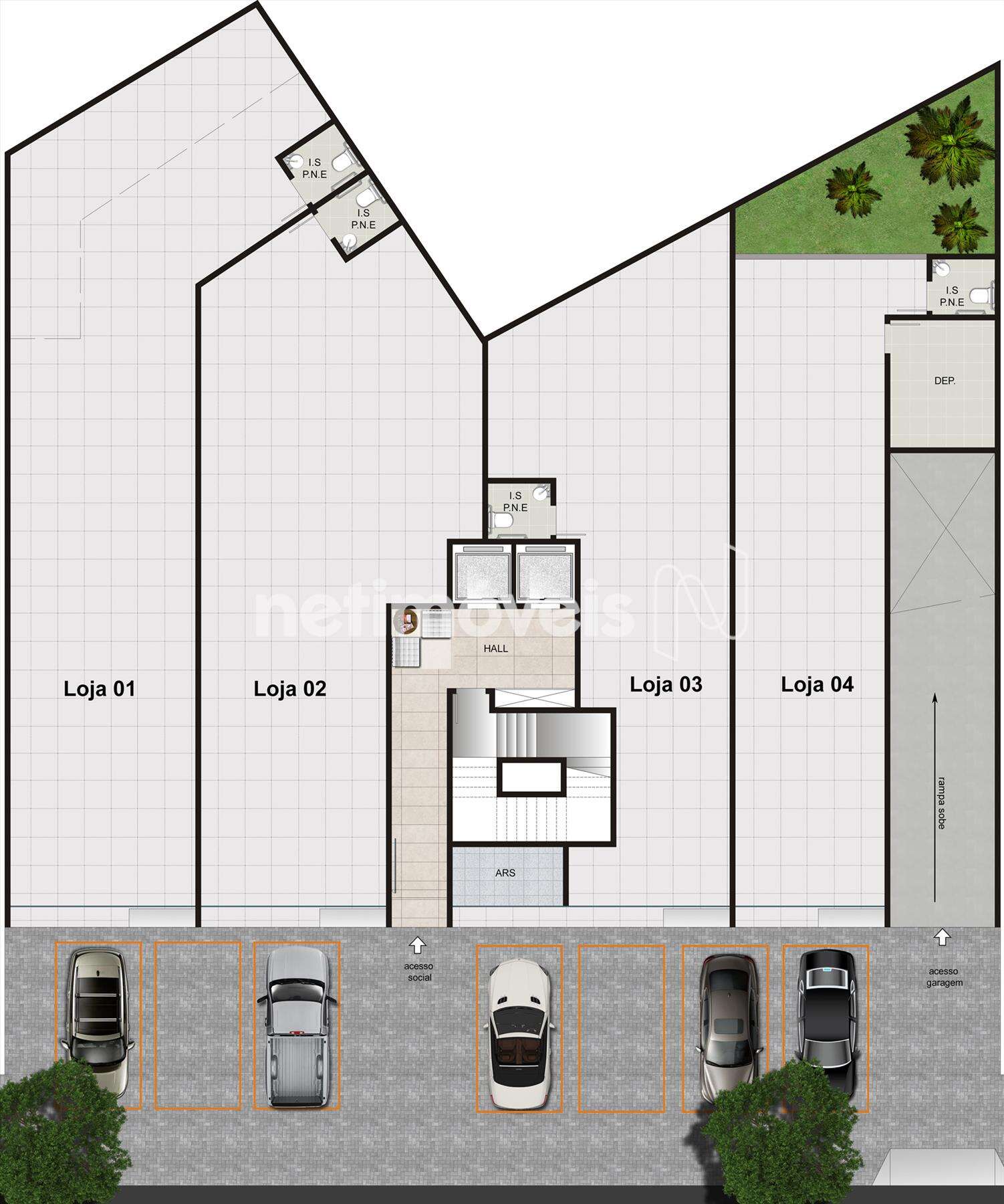 - Loja 3 = 91,35 m2 + 6,20 m2 = 97,55 m2