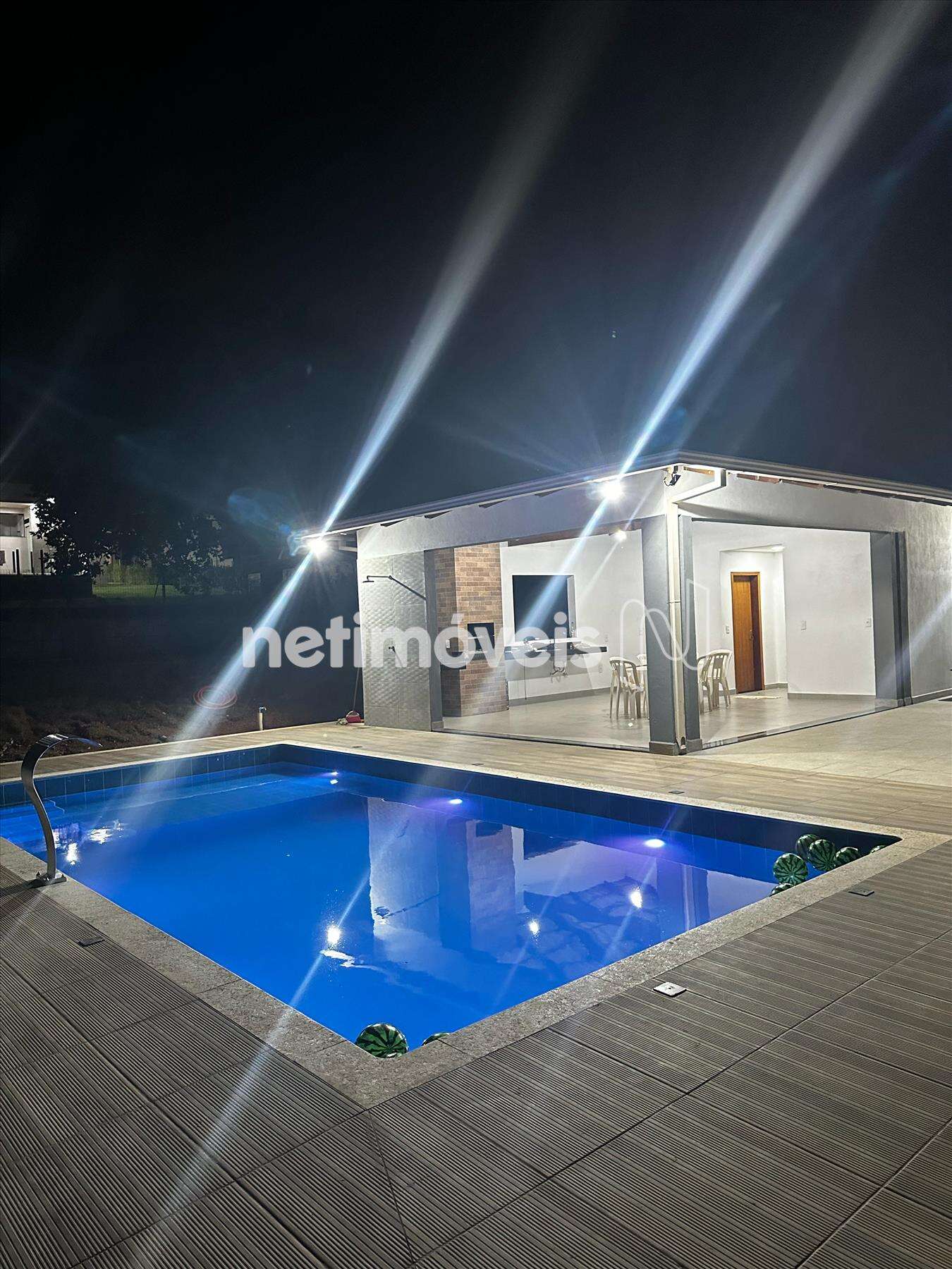 • Churrasqueira com gira grill, pia com bancada em granito e fogão cooktop, localizado em uma grande aréa sendo parte dela coberta e a outra descoberta, toda a extensão da aréa com piso em porcelanato, piscina com aquecimento solar e cascata.