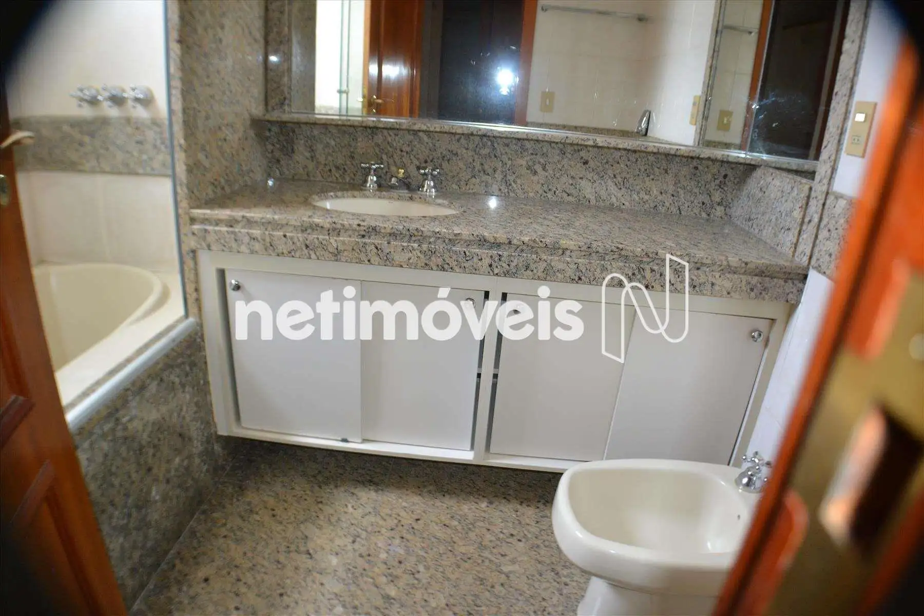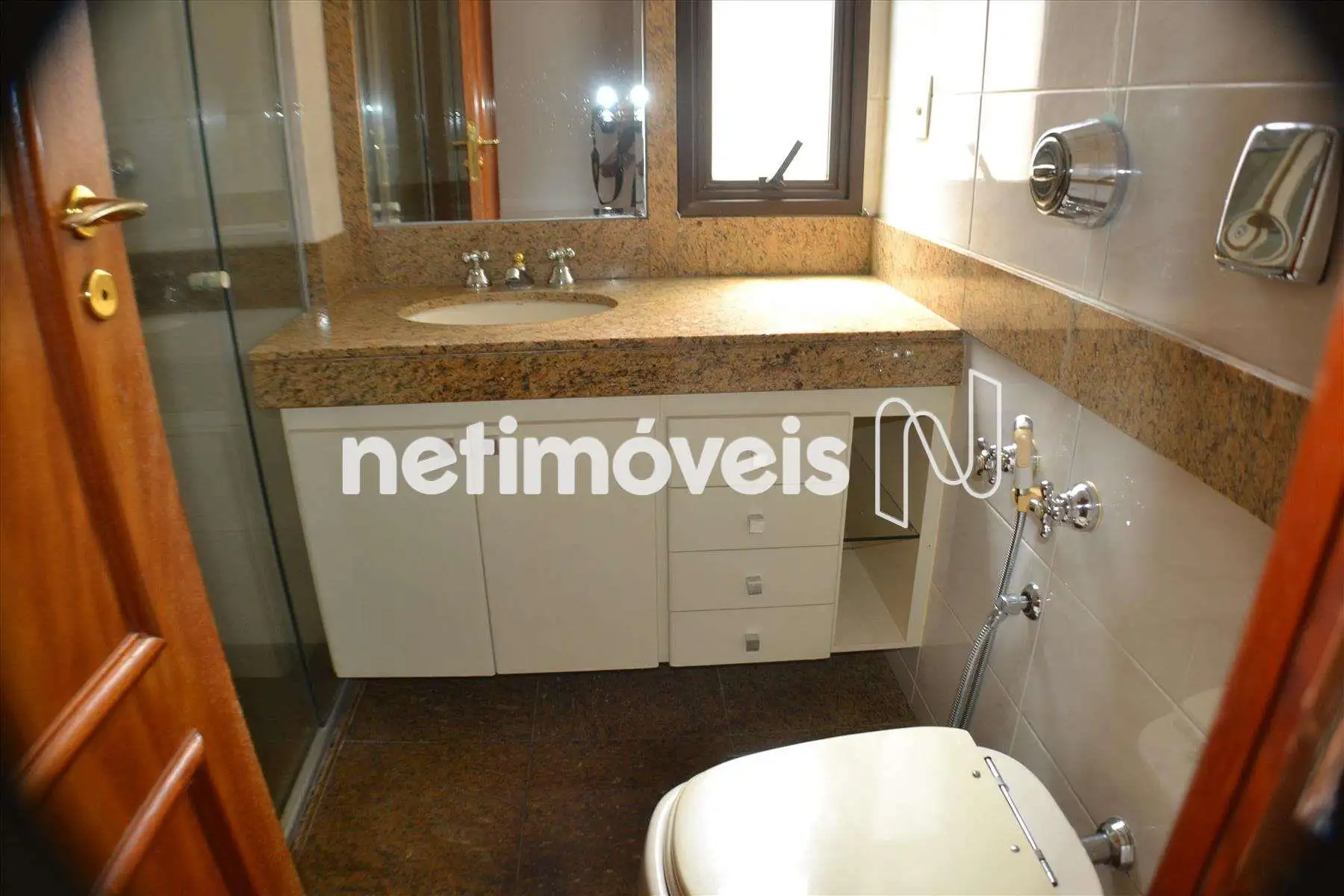 Banho social decorado, piso e bancadas em granito, armários, espelho e box em blindex.