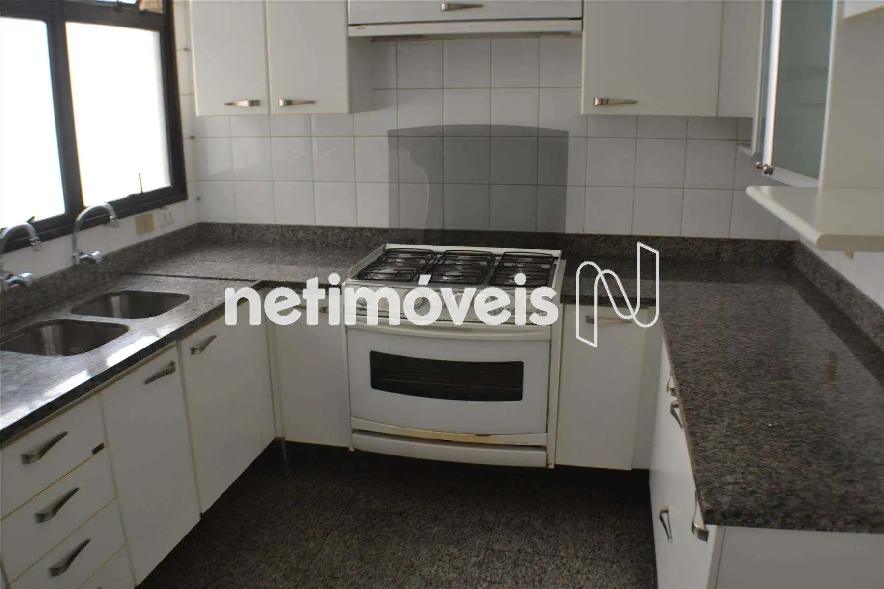 Cozinha decorada, piso e bancadas em granito com armários;