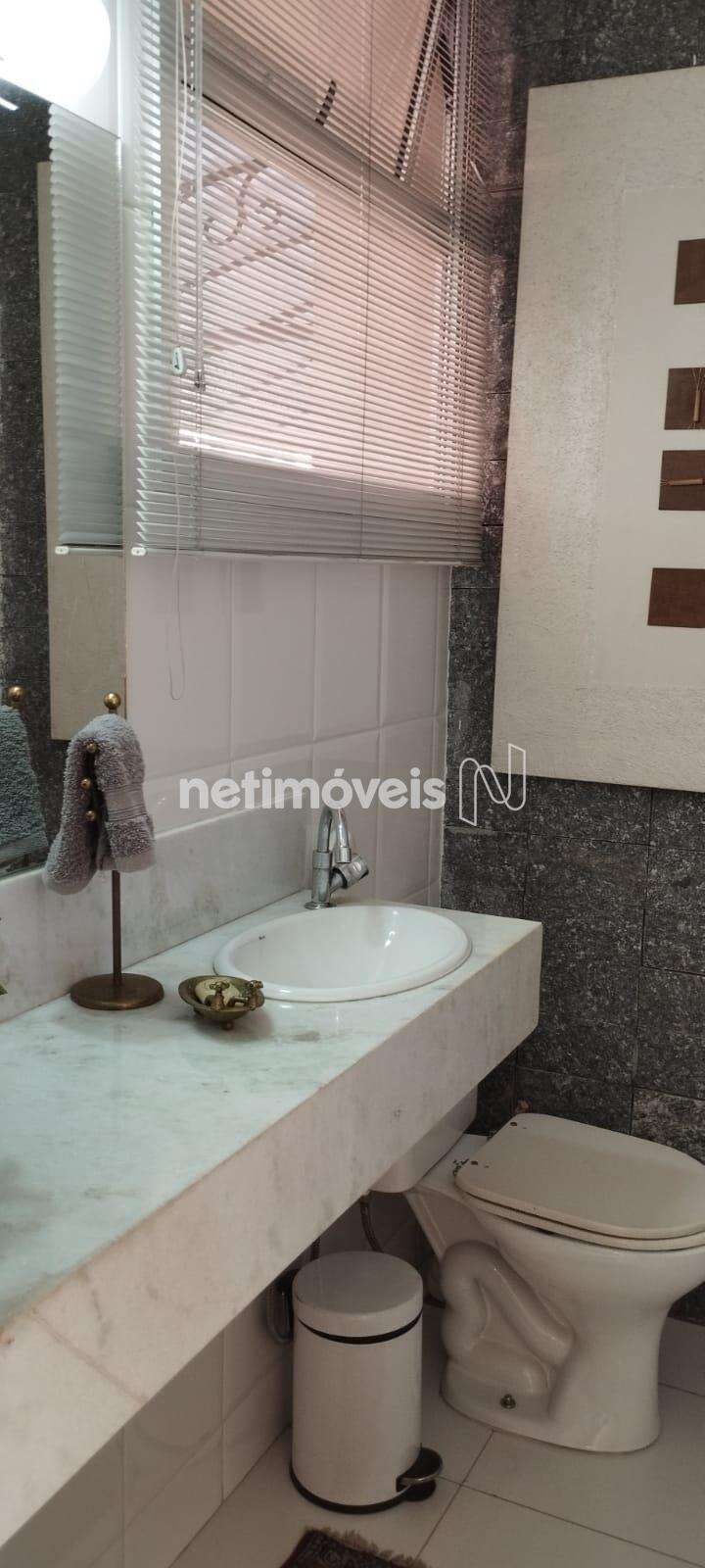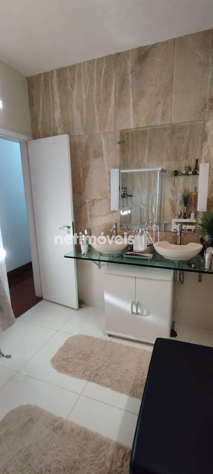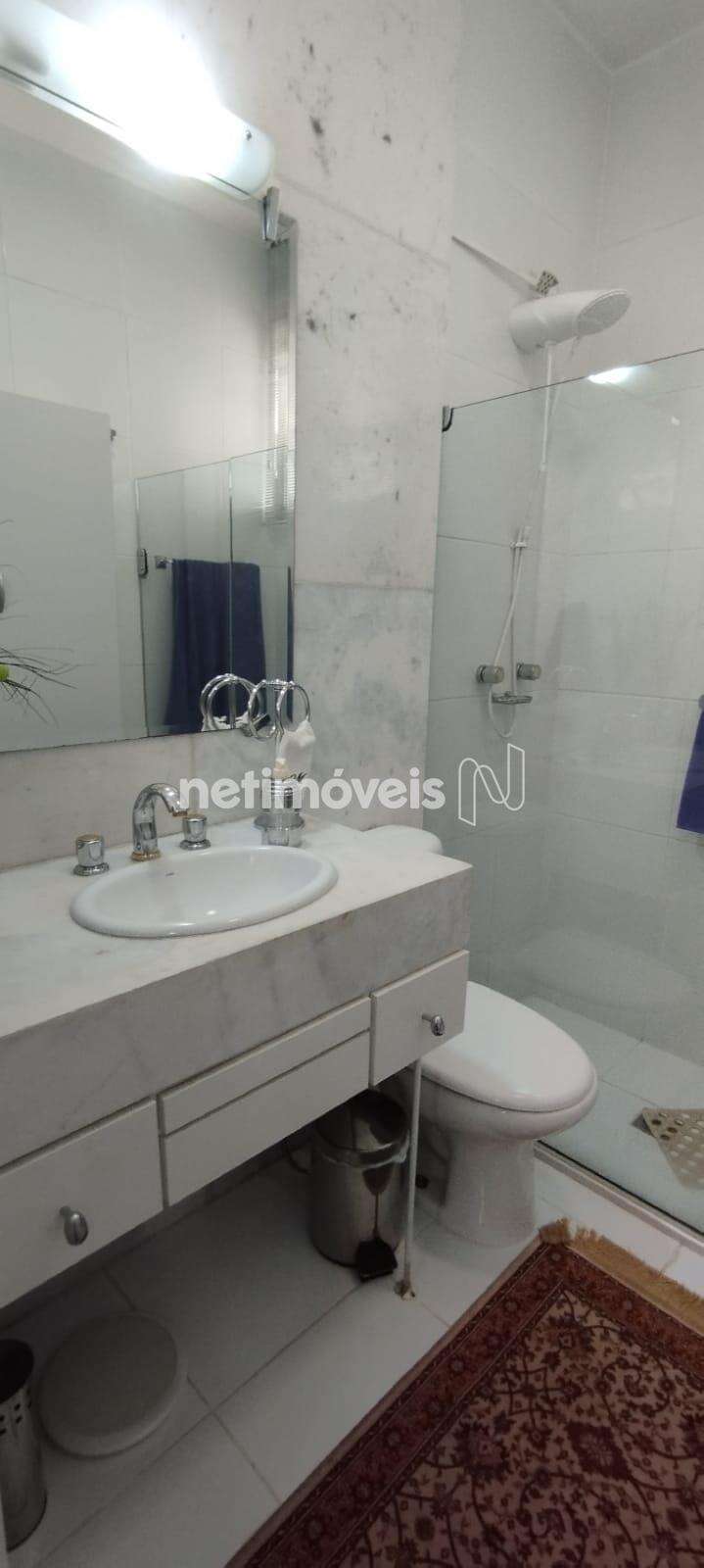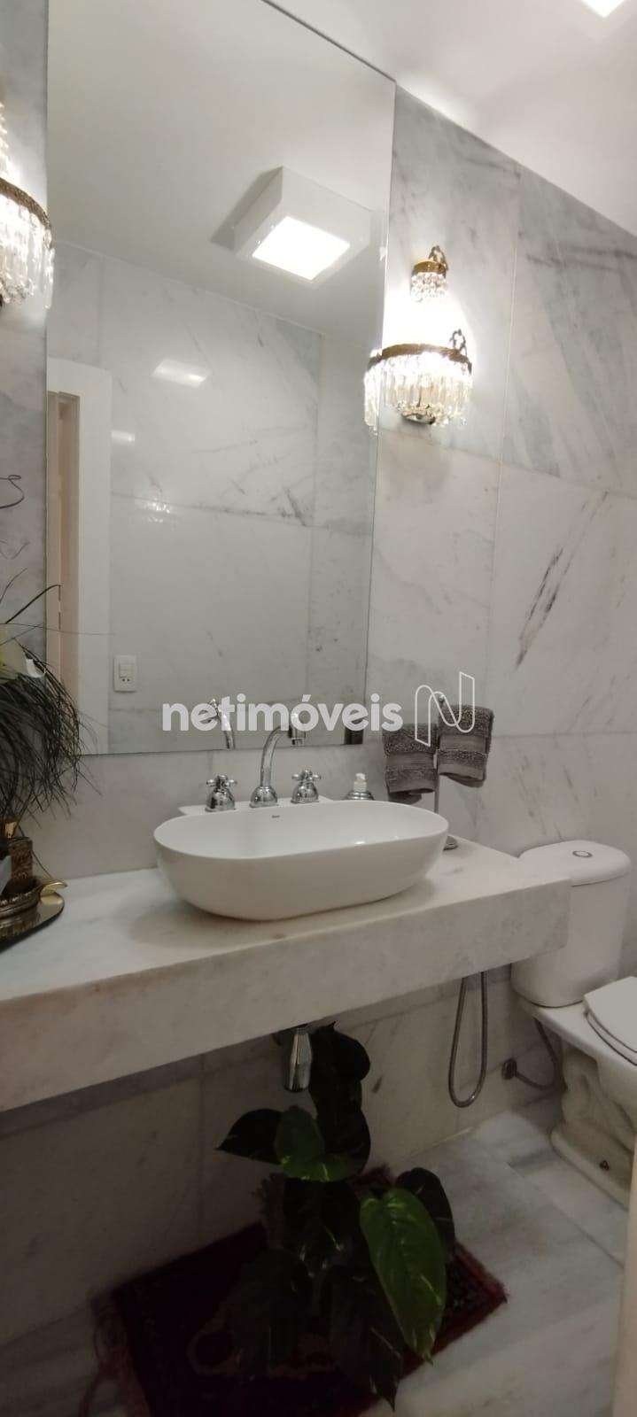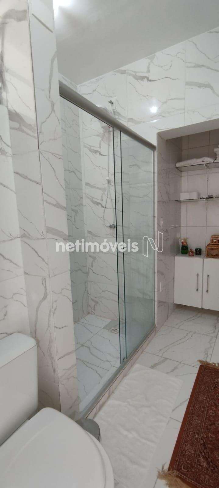 Banhos social e suite com pisos em porcelanato, bancadas em mármore, armários e box blindex