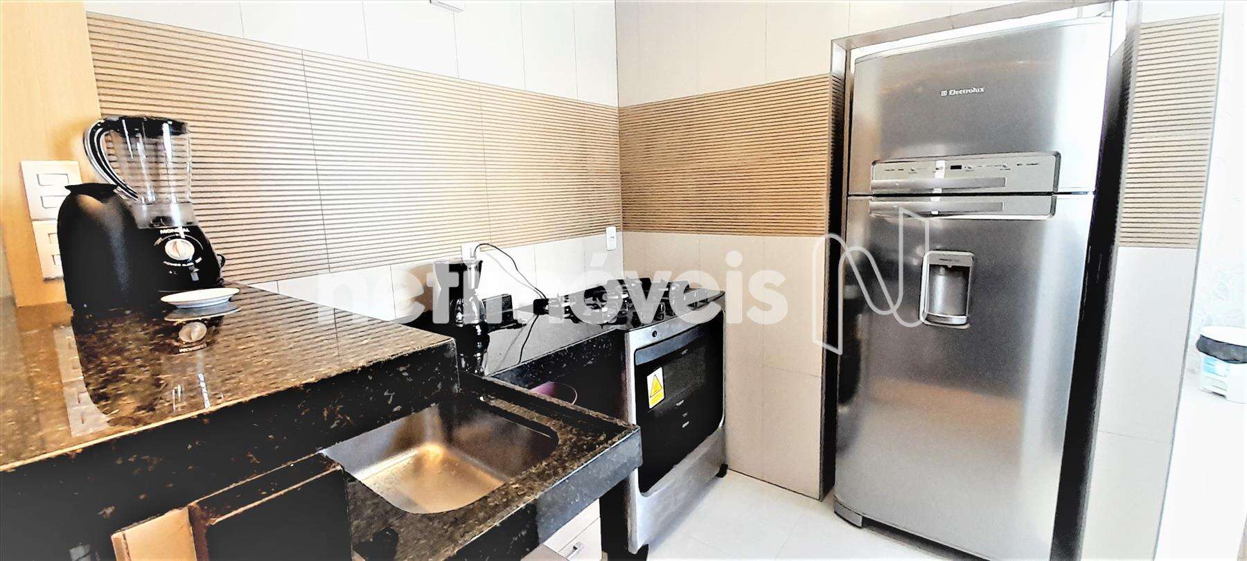 A cozinha possui armários, com fogão e geladeira inclusos, área de serviço com banheiro e um quarto de serviço que pode ser uma despensa.