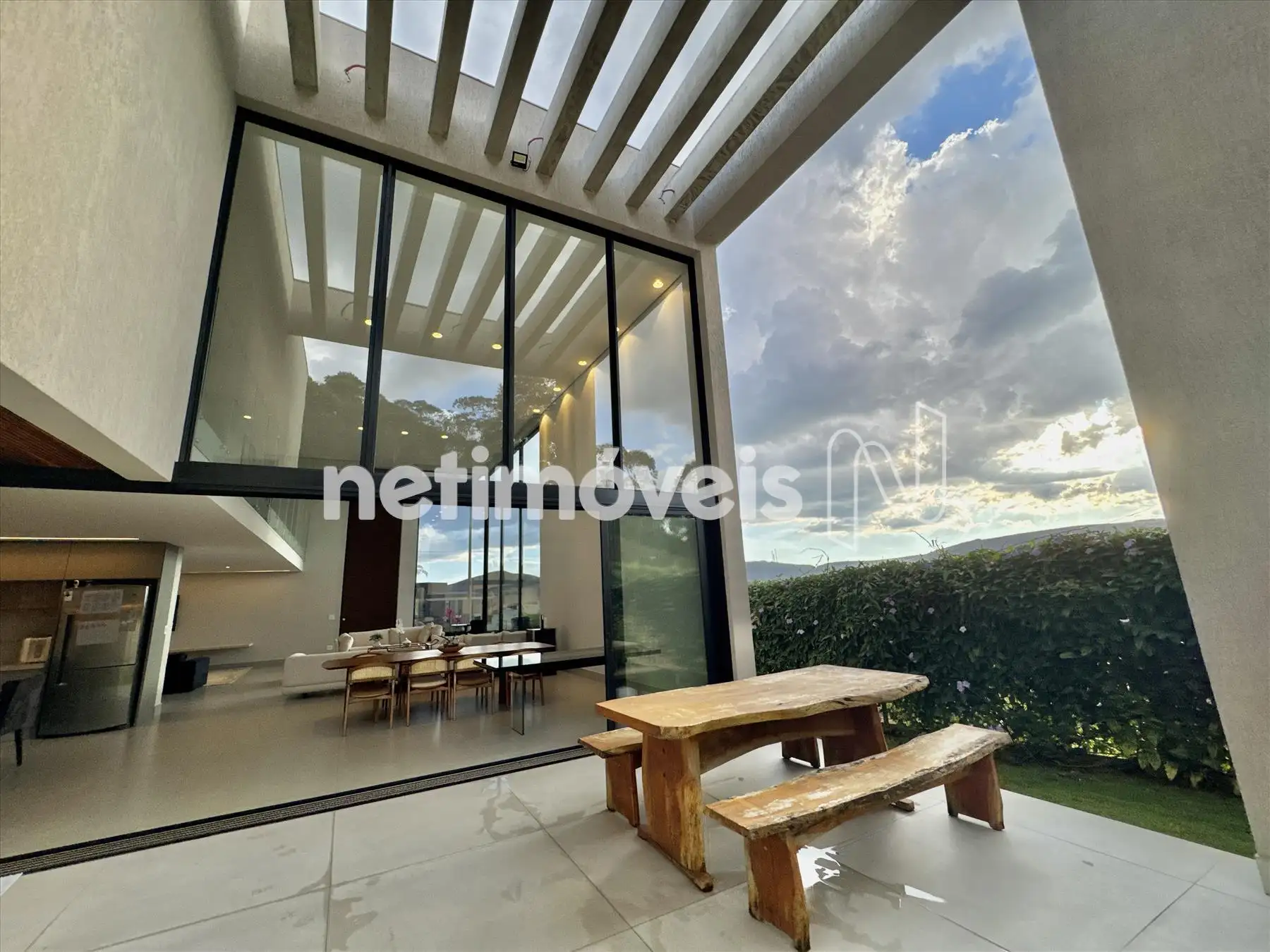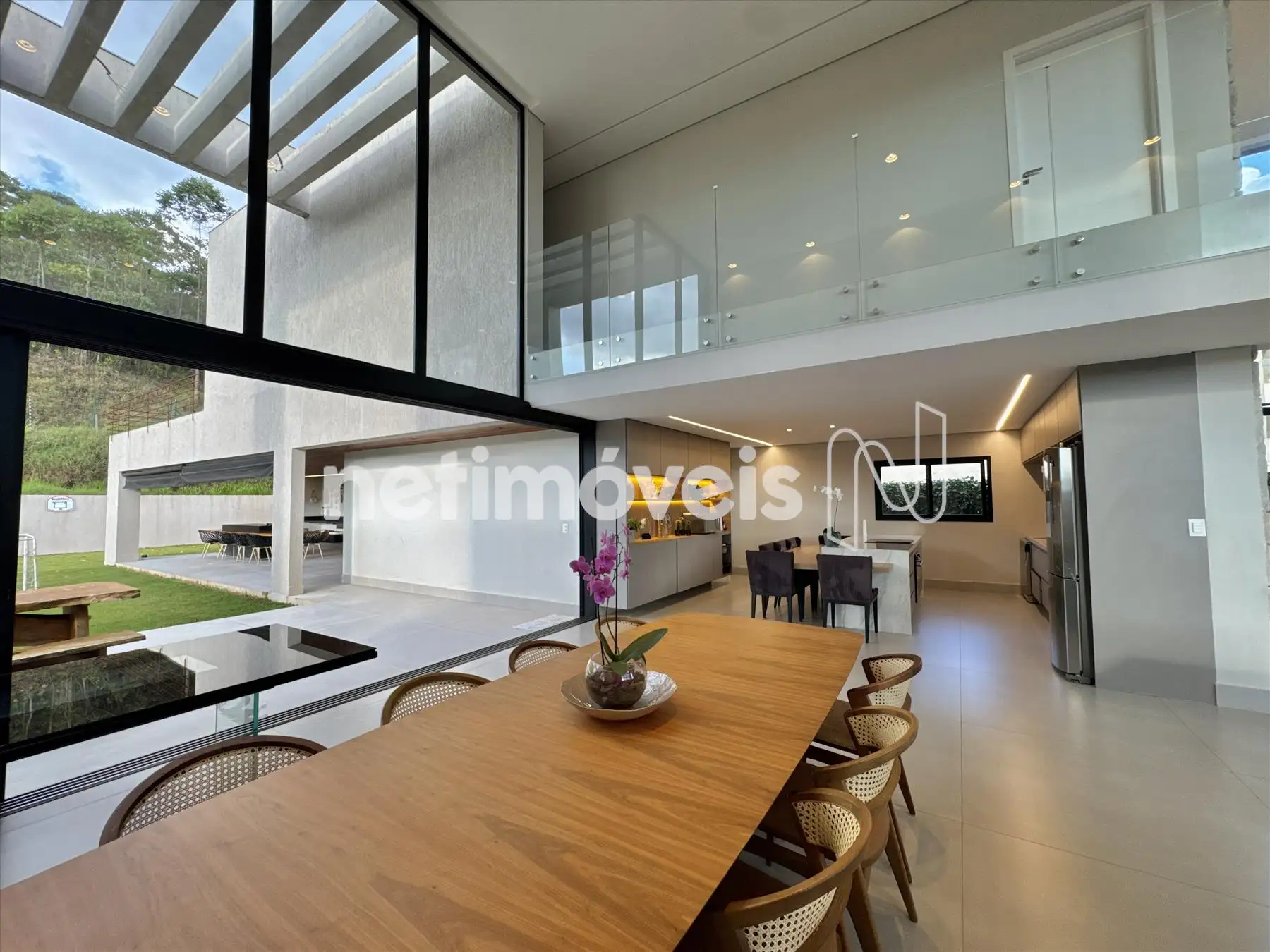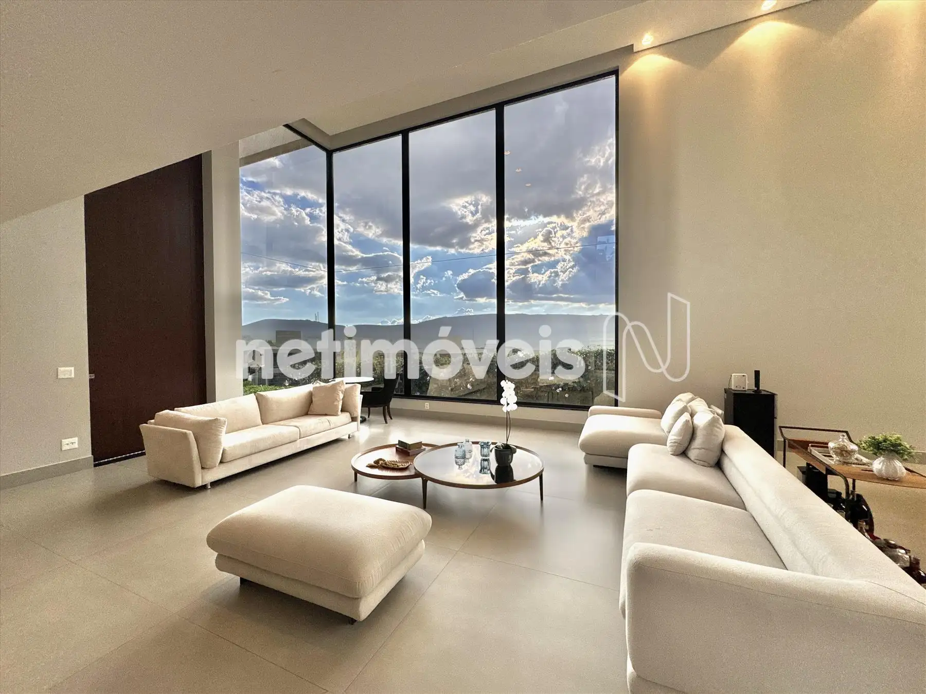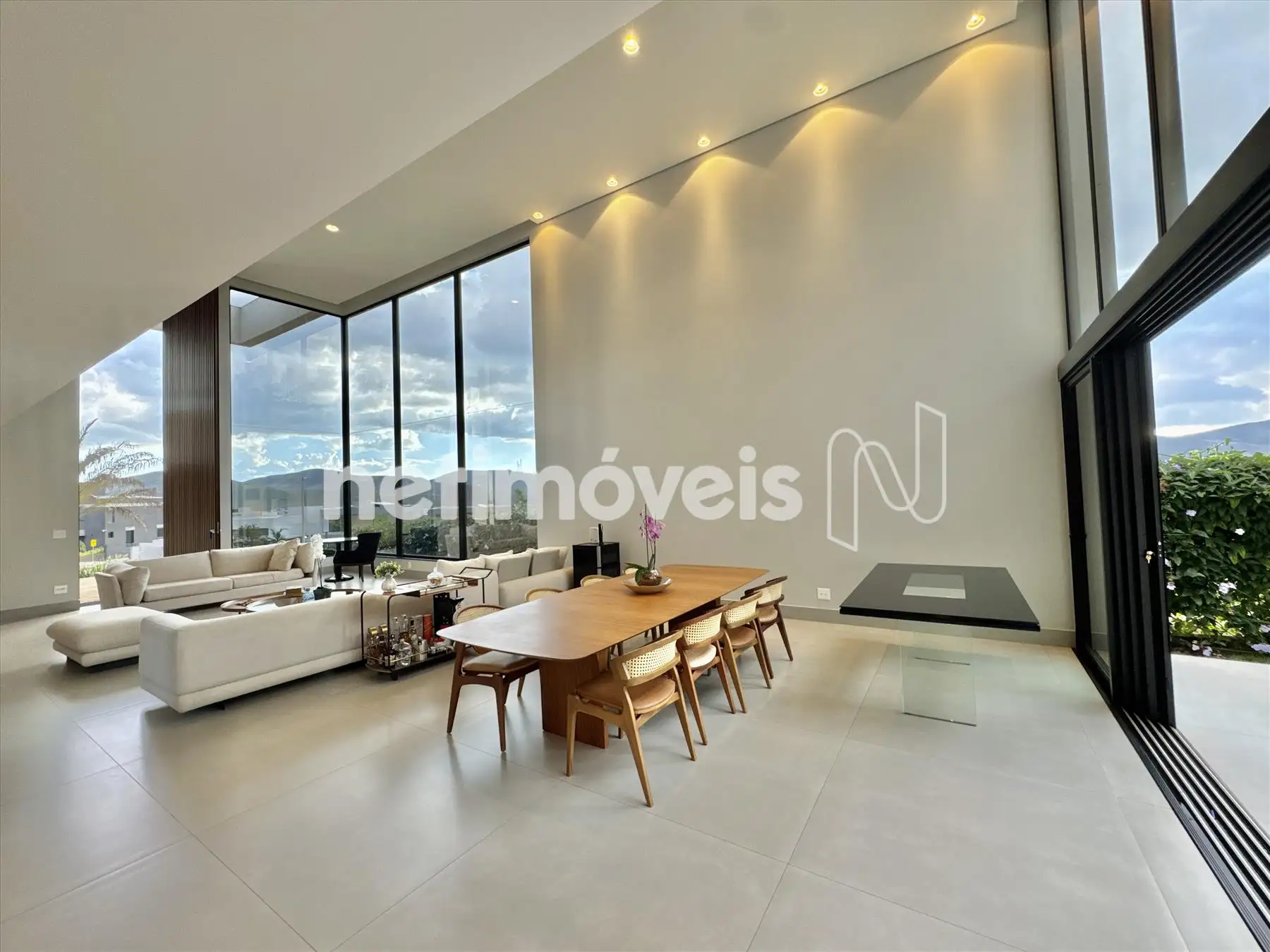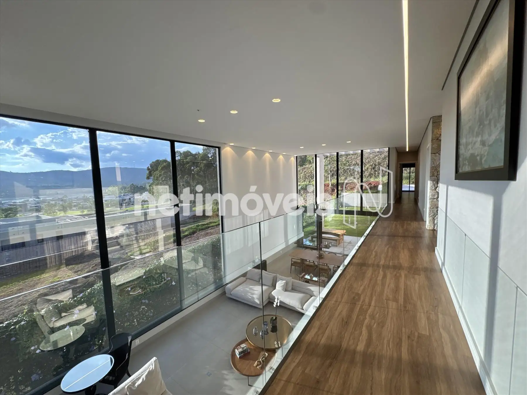 A casa possui amplas janelas nas salas e na suíte principal para propiciar uma vista deslumbrante e indevassável para a Lagoa dos Ingleses e Serra da Moeda.