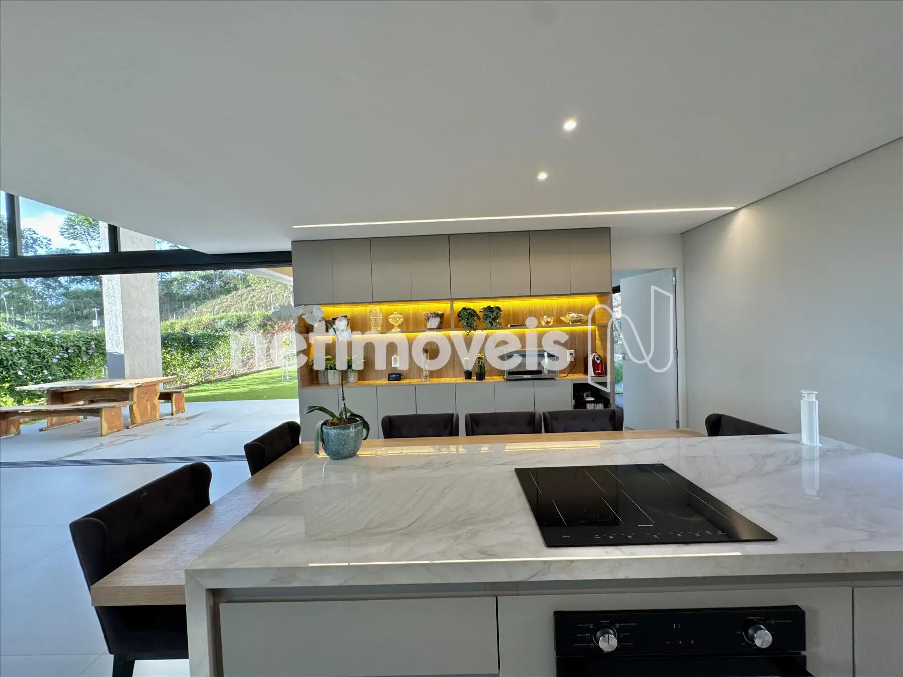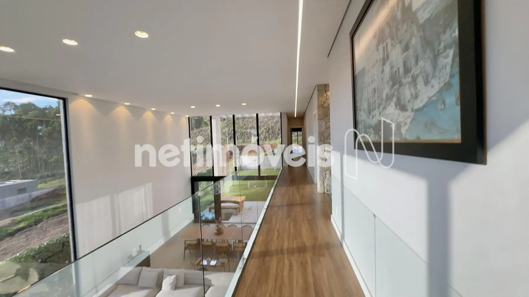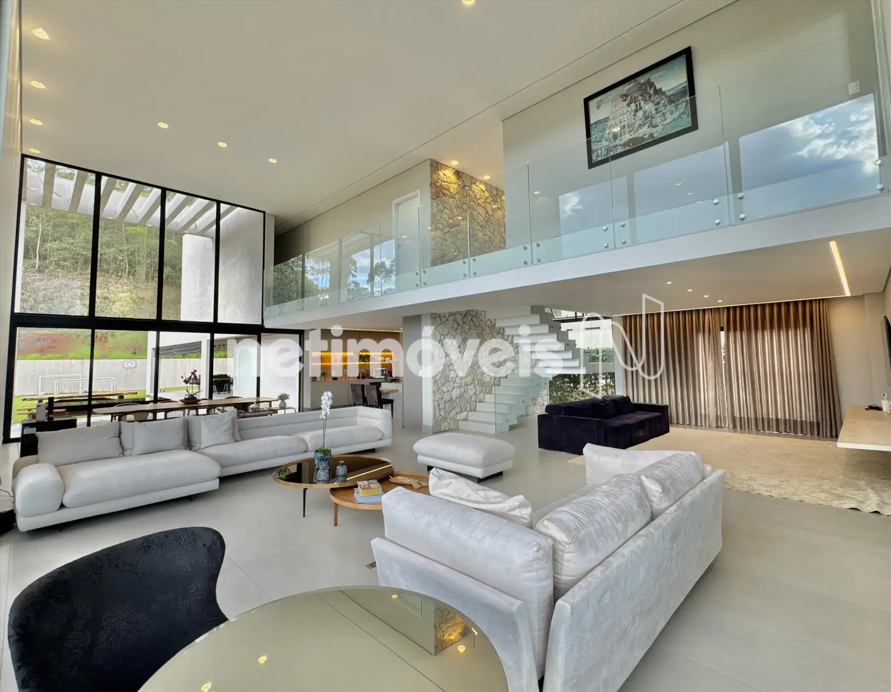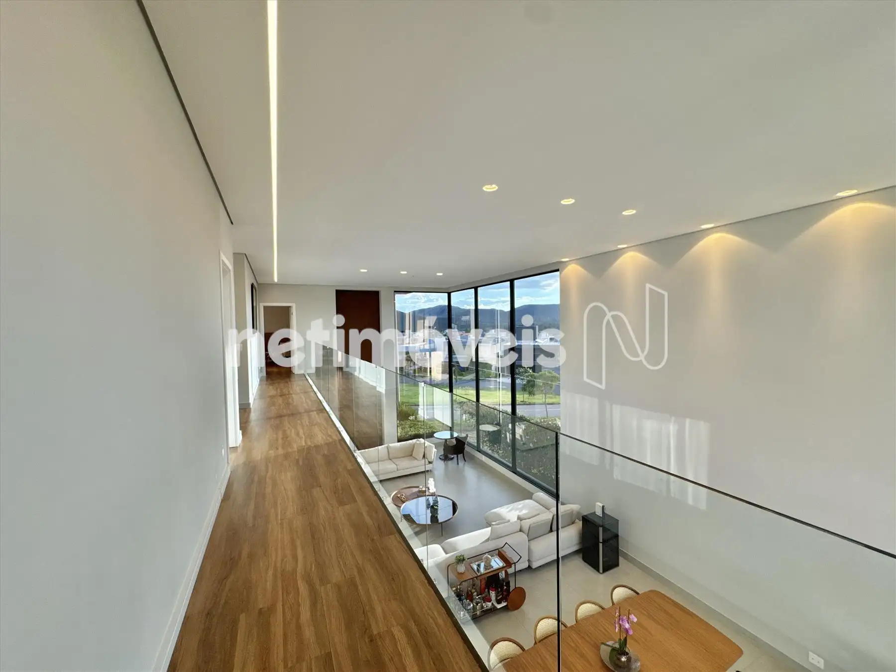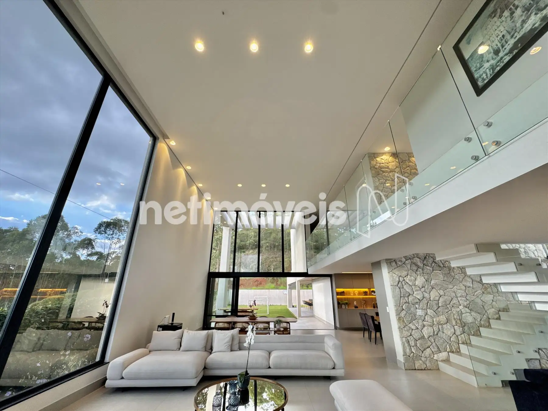 A casa possui amplas janelas nas salas e na suíte principal para propiciar uma vista deslumbrante e indevassável para a Lagoa dos Ingleses e Serra da Moeda.