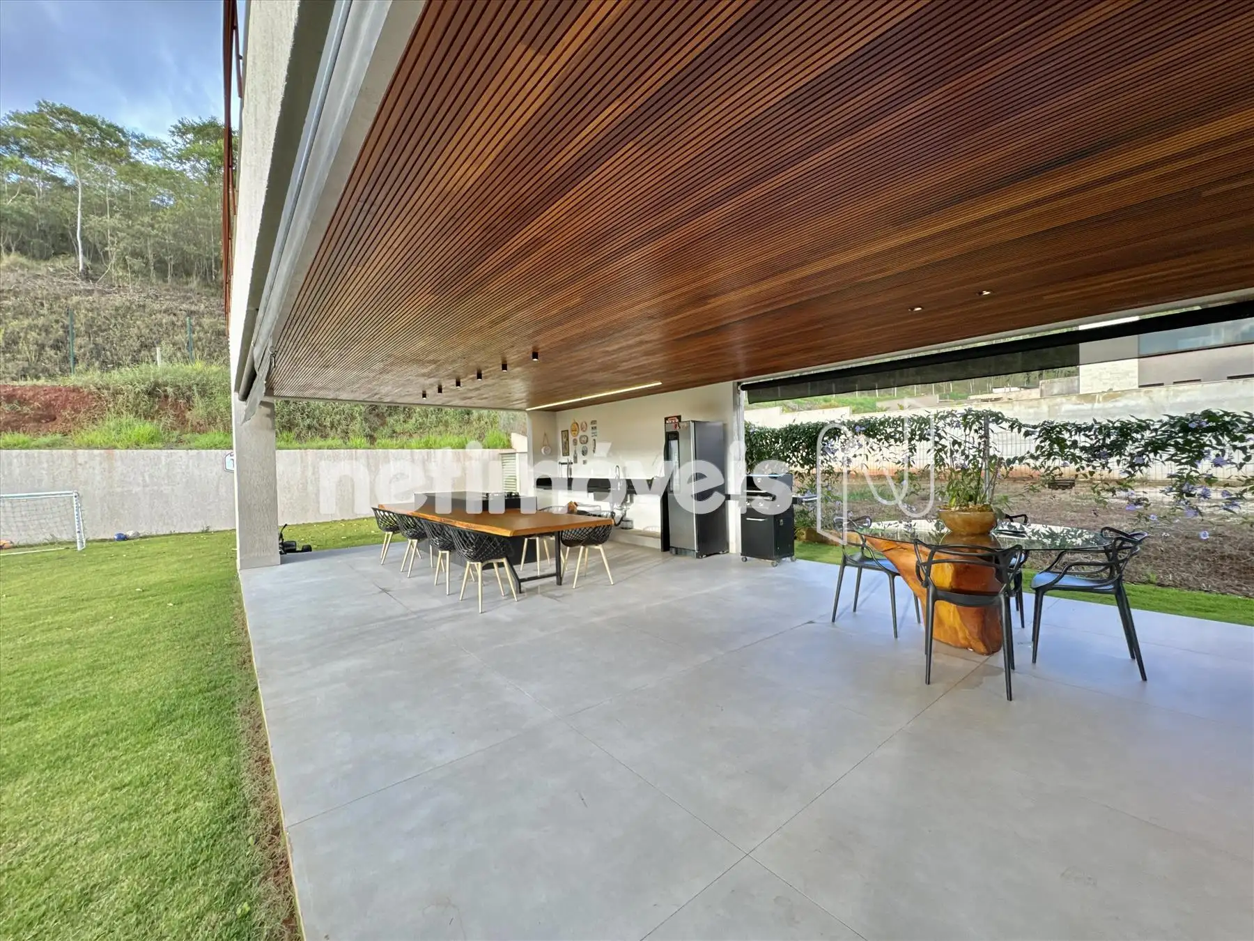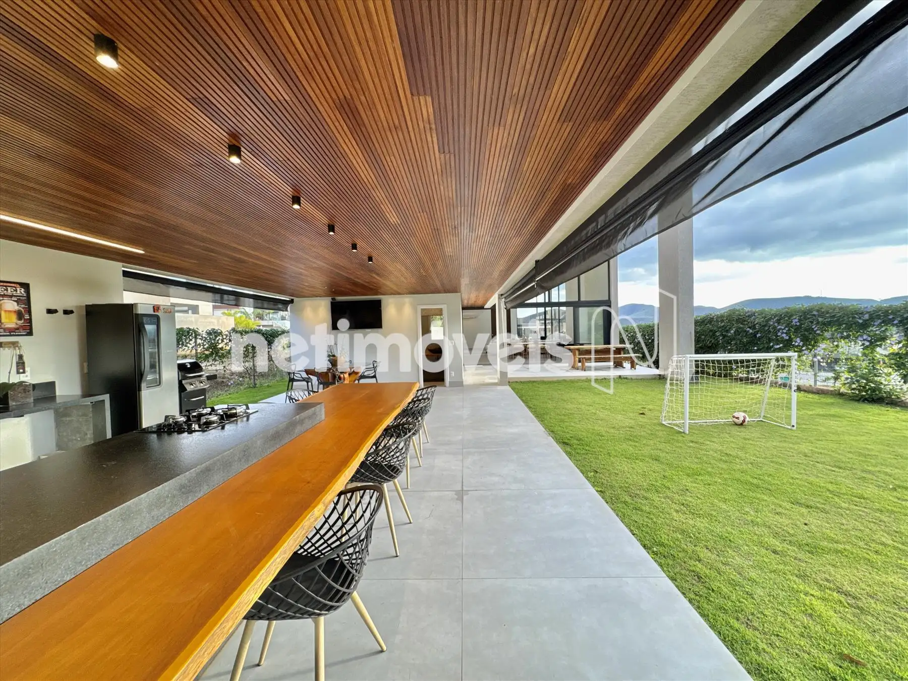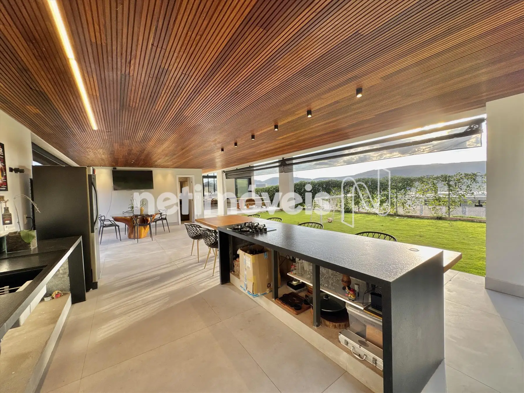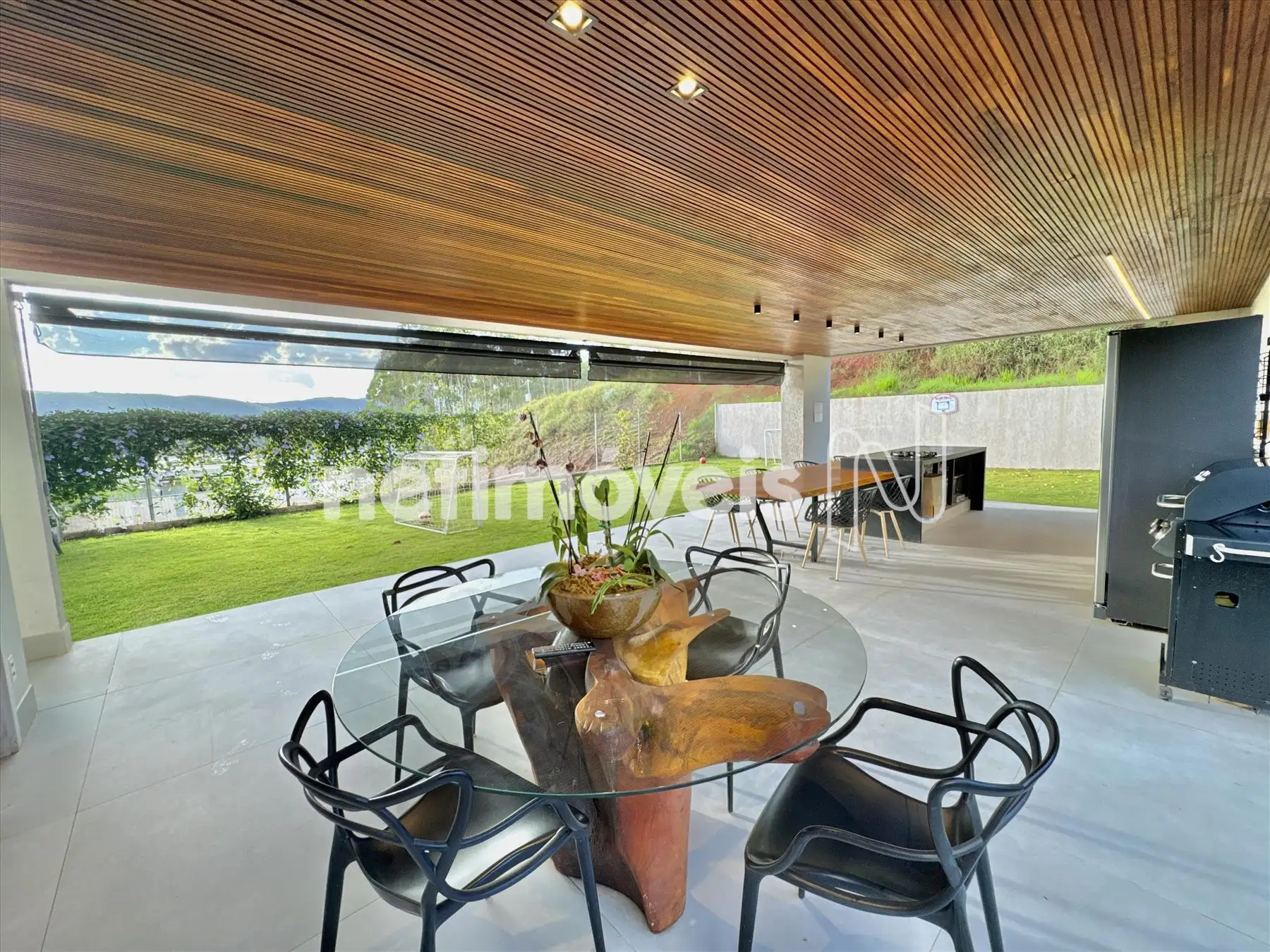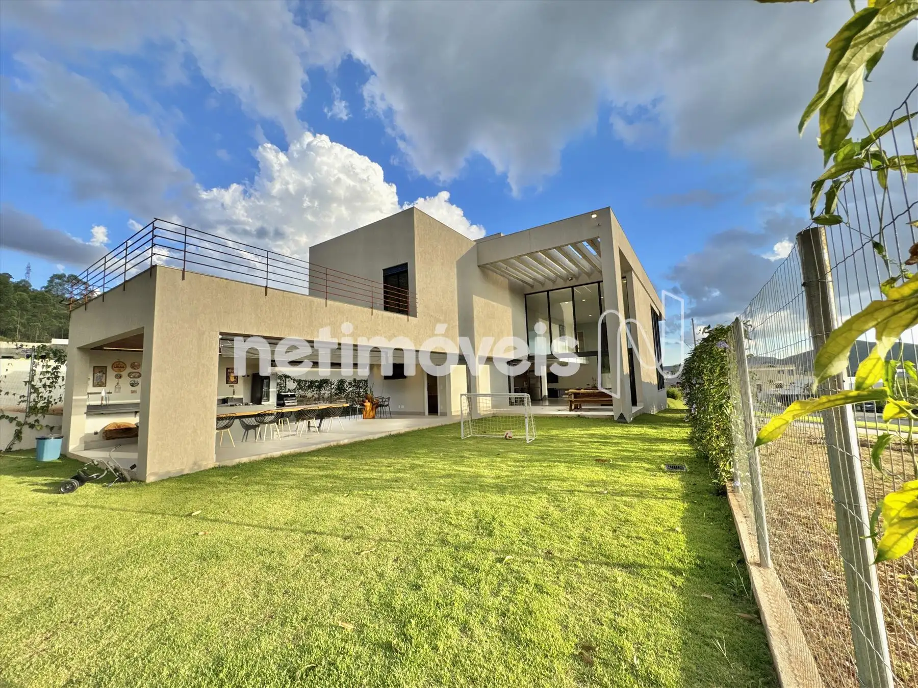 A casa possui amplas janelas nas salas e na suíte principal para propiciar uma vista deslumbrante e indevassável para a Lagoa dos Ingleses e Serra da Moeda.