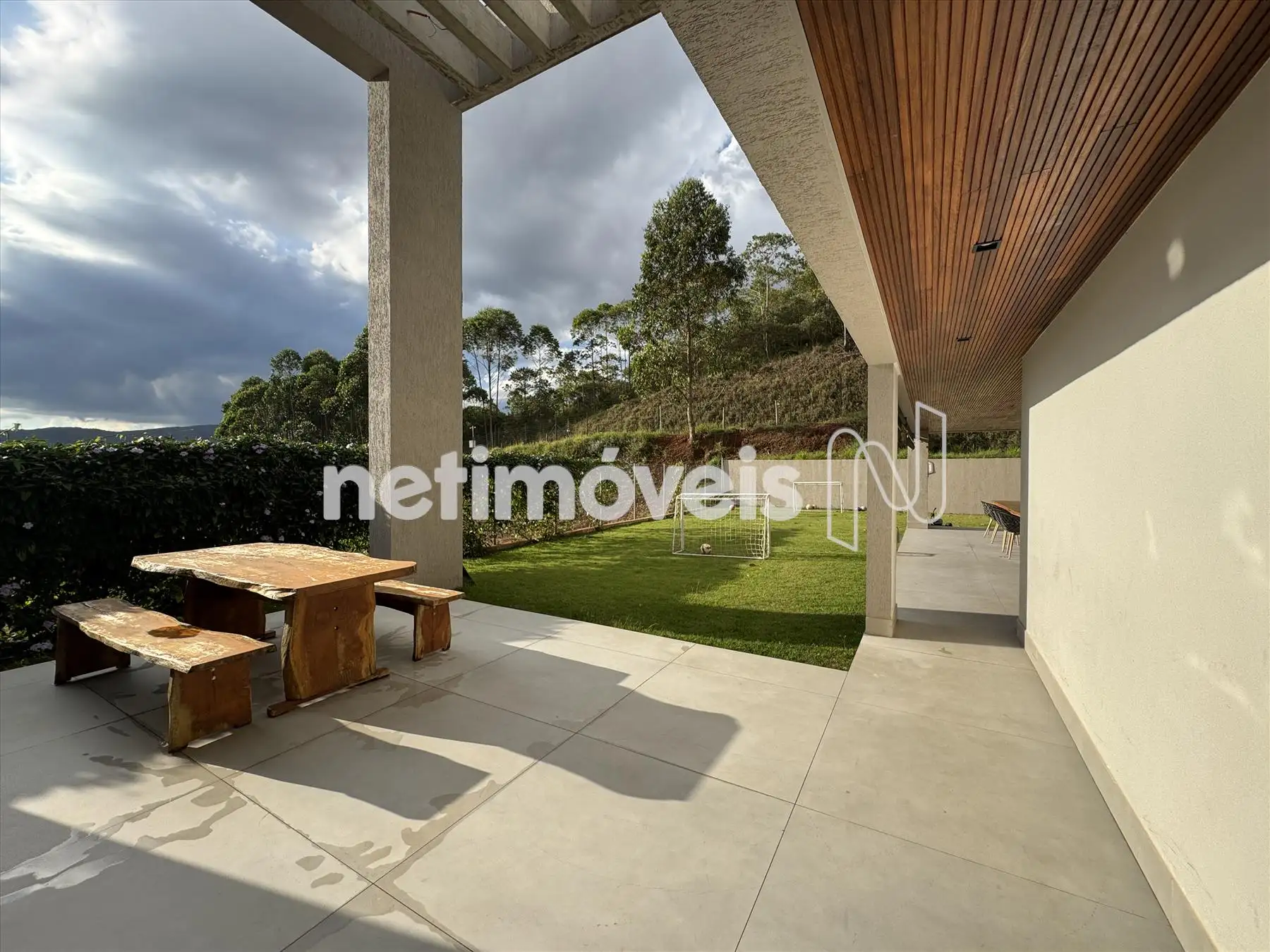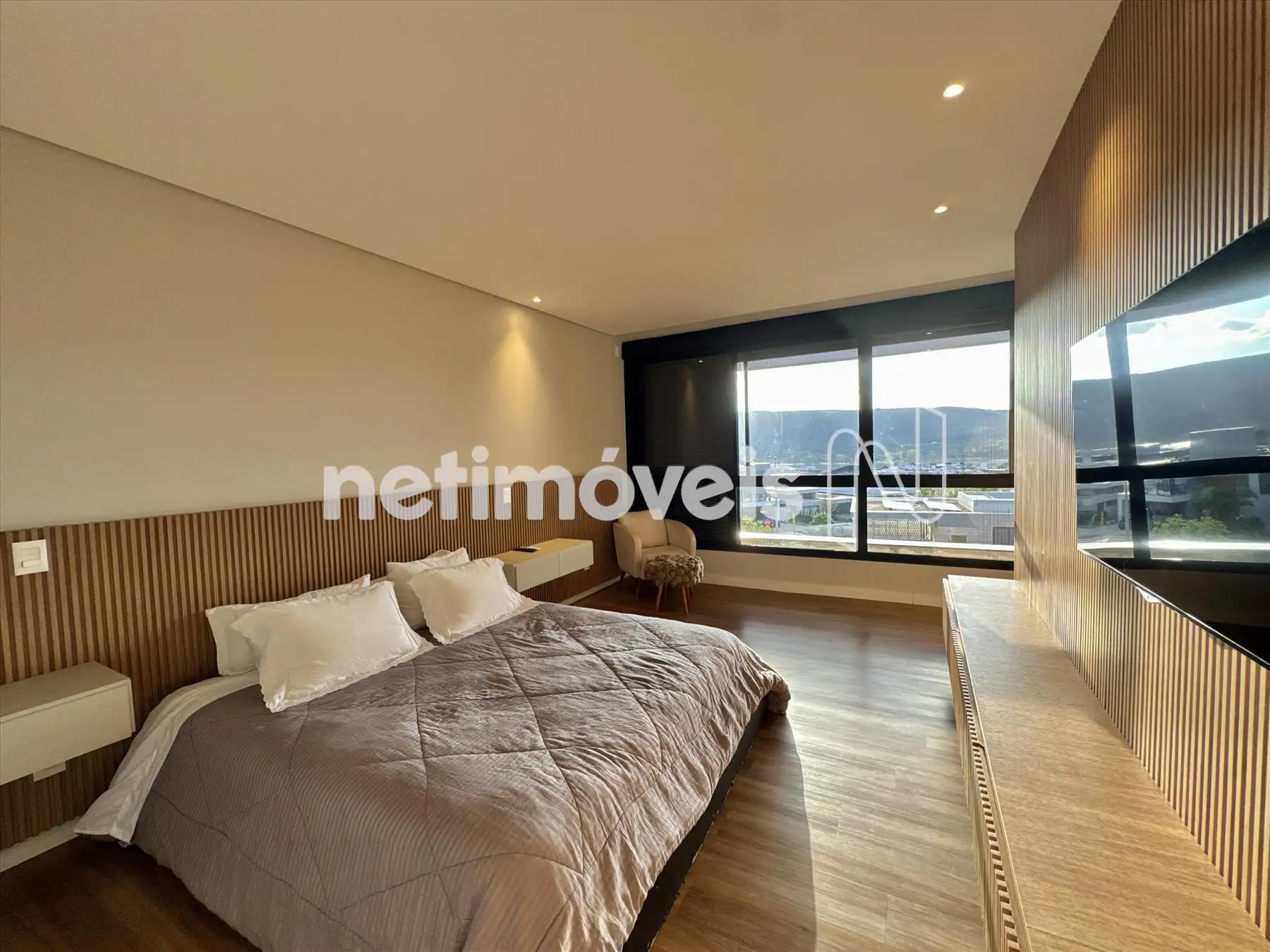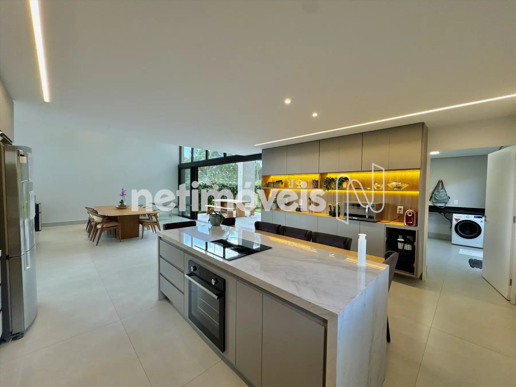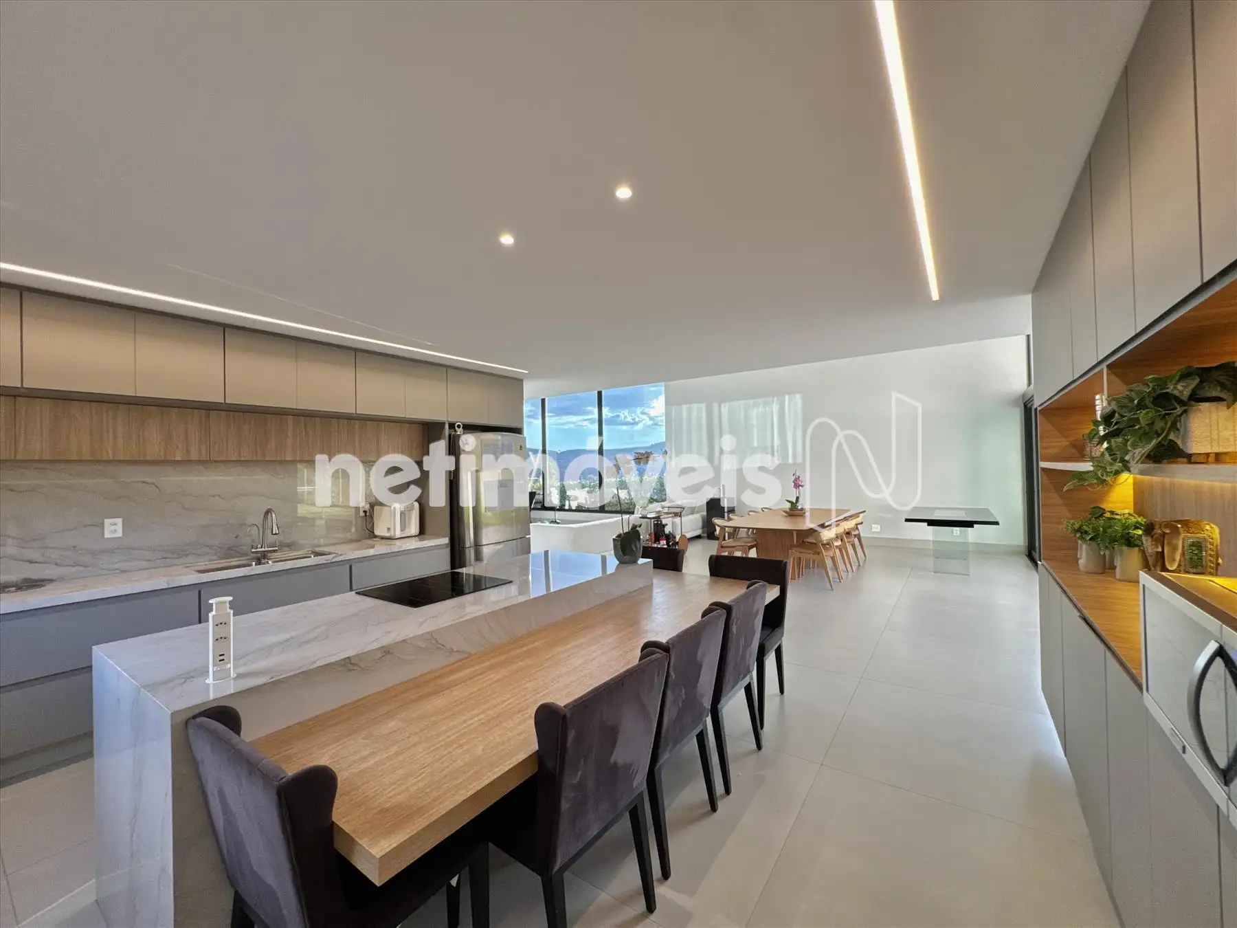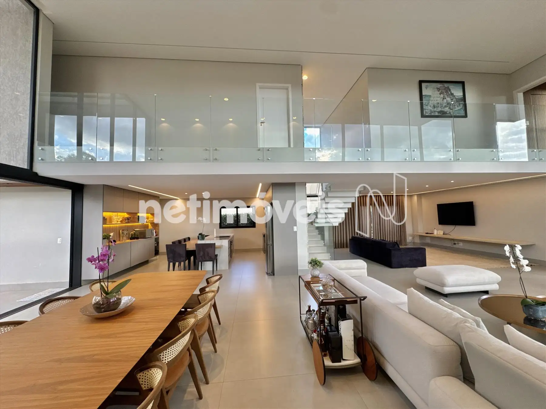 A casa possui amplas janelas nas salas e na suíte principal para propiciar uma vista deslumbrante e indevassável para a Lagoa dos Ingleses e Serra da Moeda.