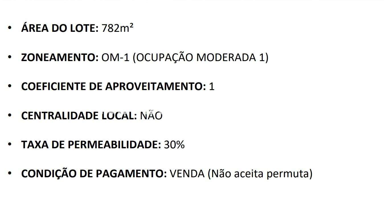 Excelente localização no bairro !! Area do lote: 782m² • zoneamento: om-1 (ocupação moderada 1) • coeficiente de aproveitamento: 1 • centralidade local: não • taxa de permeabilidade: 30% • condição de pagamento: venda (não aceita permuta).