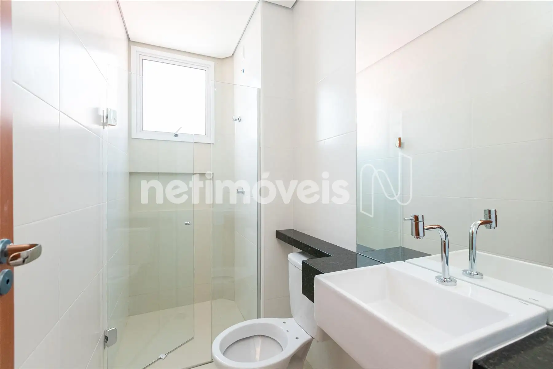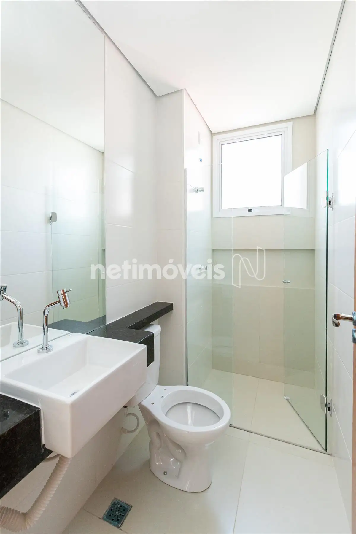 Banhos social e suíte com box blindex, nicho no box e espelho.