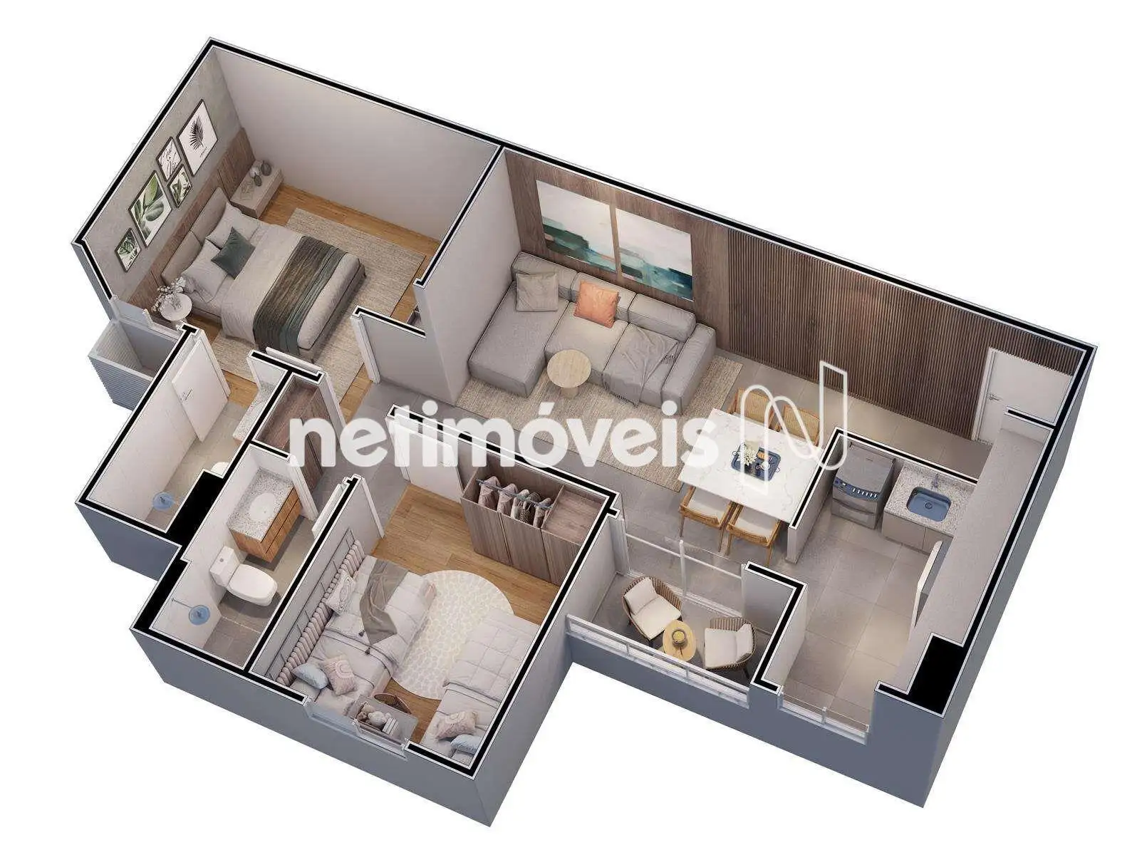 - 2 quartos, sendo 1 suíte;